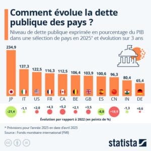 Le cas français retient particulièrement l'attention des analystes : - Le Fonds Monétaire International (FMI) prévoit une dette publique atteignant 116% du PIB d'ici fin 2025 - Ces projections ont été officialisées dans le rapport d'avril 2025 du FMI - Cette évolution intervient dans un contexte de ralentissement des perspectives de croissance économique mondiale