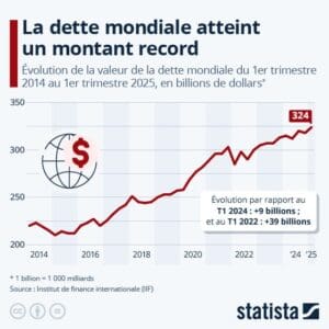 Selon les statistiques publiées ce mois-ci, la dette mondiale a connu une augmentation de 7.500 milliards de dollars américains (soit 7,5 billions) au premier trimestre 2025. Cette progression marque une accélération par rapport aux tendances observées en 2024.