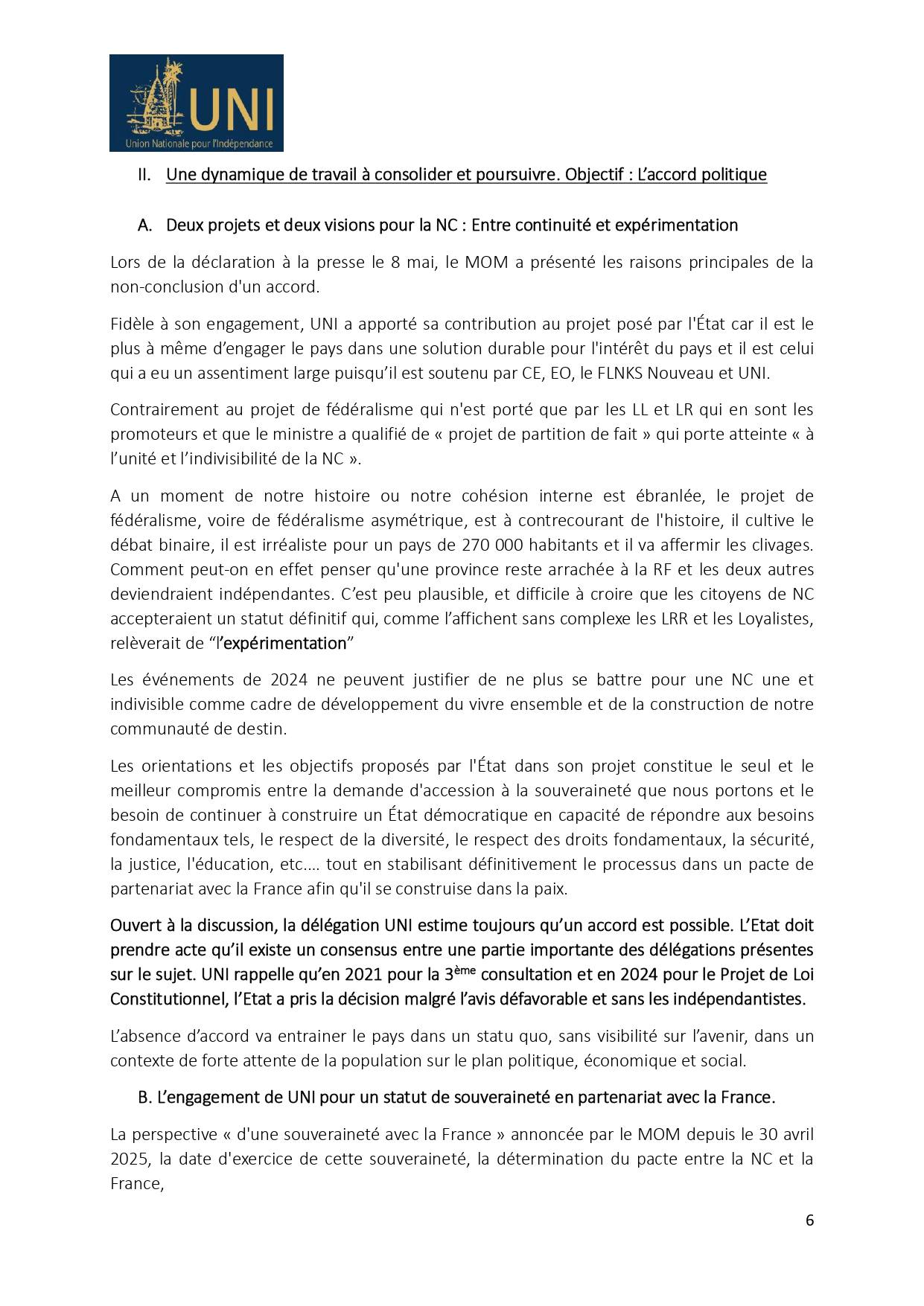 "Fidèle à son engagement, l'UNI a apporté sa contribution au projet posé par l'État car il est le plus à même d'engager le pays dans une solution durable", précisent les dirigeants indépendantistes.