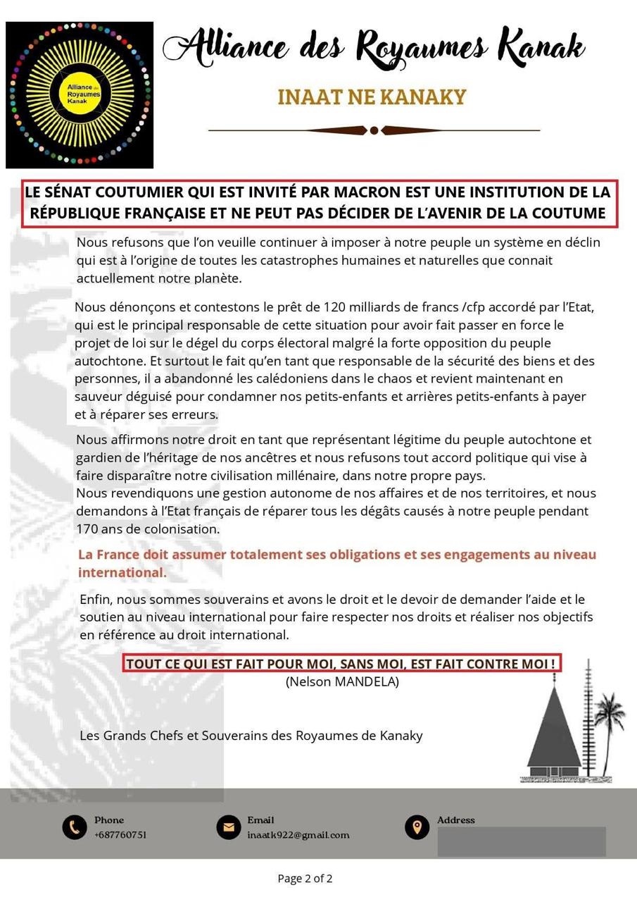 l’Alliance des Royaumes Kanak ne reconnaît plus la légitimité de l’État français, ni celle des représentants politiques locaux, et entend porter seule, avec ses chefs coutumiers, la parole du peuple kanak.