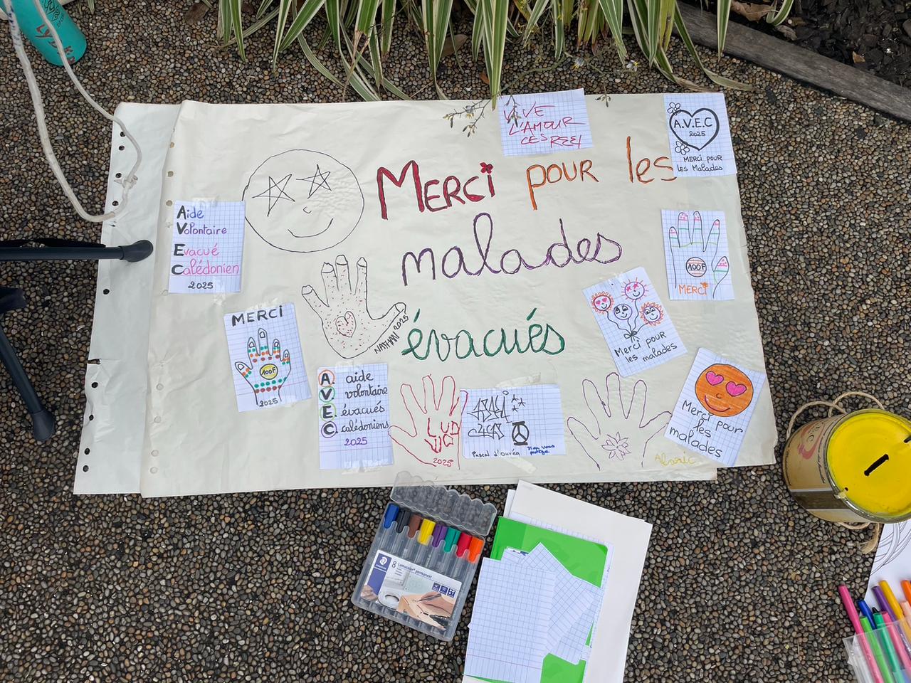 explique sa présidente, Marie-Claude Hellouin, lucide mais déterminée. Une cagnotte, mais aussi un moyen pour chaque Calédonienne et chaque Calédonien de remercier cette association, en inscrivant ou dessinant, sur des fresques mises à disposition à l'entrée de grandes surfaces — comme c’est le cas au Leader Price de Magenta — un petit mot ou un dessin. Des fresques de dessins d’enfants exprimant avec une force désarmante la gratitude et la solidarité envers les malades évacués : un message simple, sincère, qui résume à lui seul le combat de l’AVEC depuis plus de quarante ans.