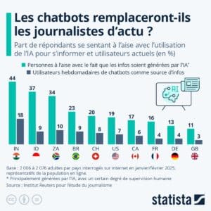 C’est une petite révolution silencieuse : dans de nombreux pays, l’intelligence artificielle s’invite dans les habitudes d’information. Selon une enquête menée par le Reuters Institute en janvier-février 2025 auprès de plus de 2 000 adultes par pays, les chatbots générateurs d’actualités sont déjà utilisés chaque semaine par 18 % des Indiens, 10 % des Sud-Africains, 9 % des Indonésiens… mais seulement par 3 % des Britanniques.
