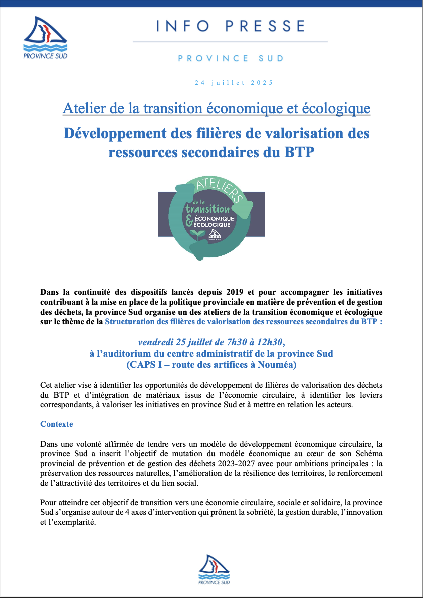 La province Sud accélère sur l’économie circulaire avec un atelier clé sur la valorisation des déchets du BTP ce 25 juillet.