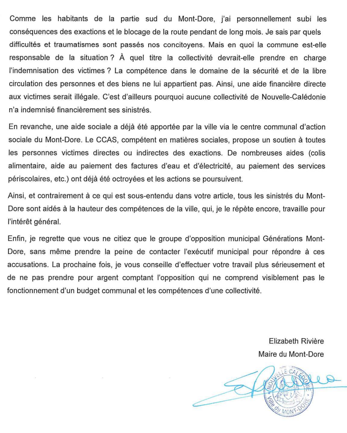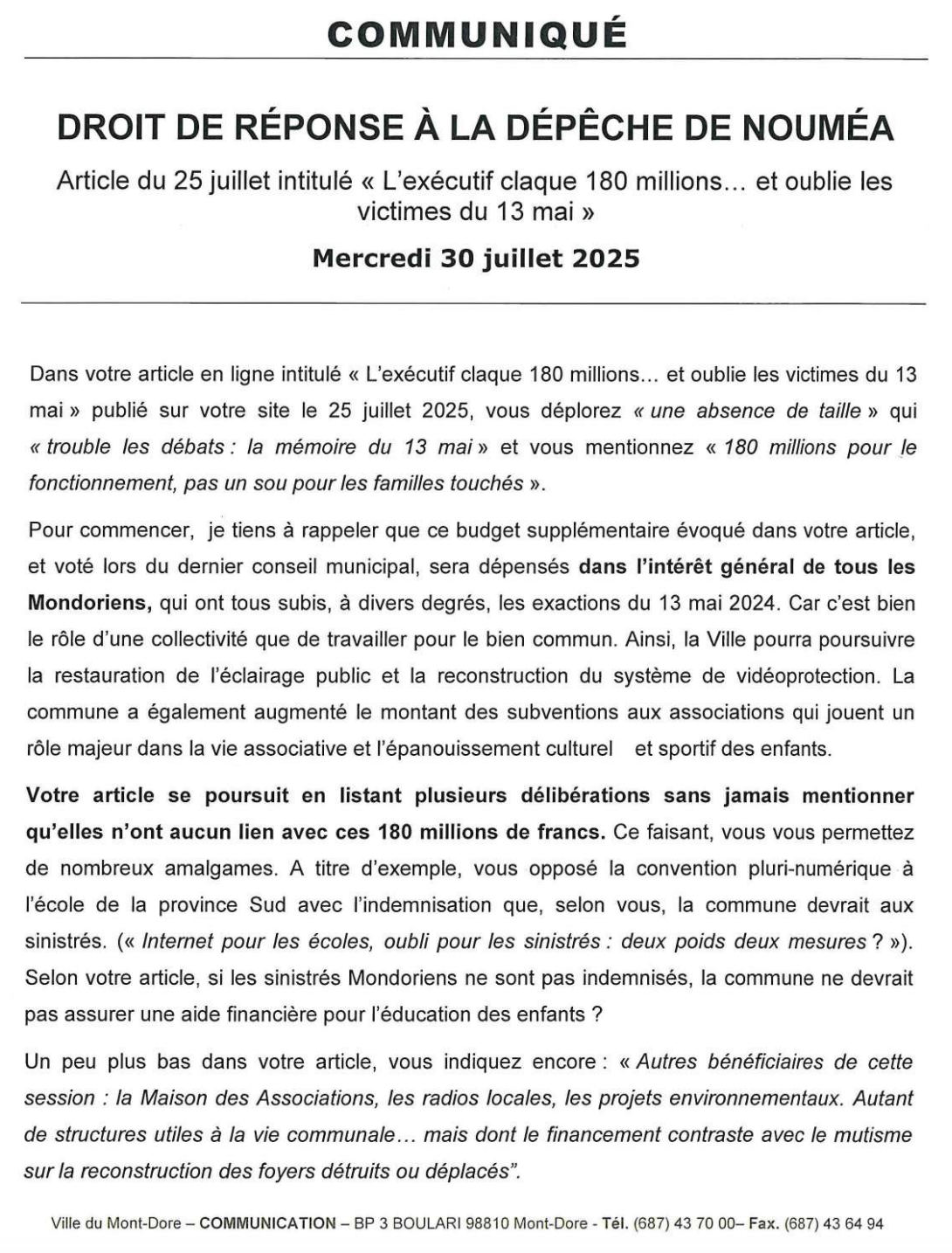 À la suite de la publication de notre article intitulé « L’exécutif claque 180 millions… et oublie les victimes du 13 mai », paru le 25 juillet dernier, la mairie du Mont-Dore a souhaité exercer son droit de réponse, que nous publions bien volontiers ci-dessous, conformément aux principes fondamentaux de la liberté de la presse.