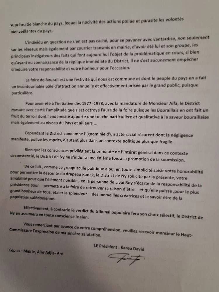 Le ton monte en fin de courrier. Le district de Ny exige le retrait de Levay Roy de toute responsabilité liée à l’événement. Il refuse de s’associer à une Foire qui cautionnerait, même implicitement, « un acte racial récurrent » perpétré dans l’indifférence et la négligence.