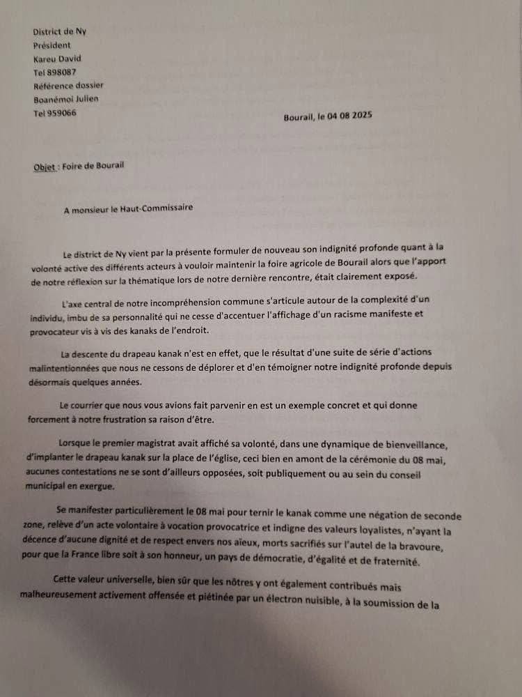Un parfum de scandale politique et identitaire entoure la Foire de Bourail 2025. Dans un courrier daté du 4 août, le district de Ny, par la voix de son président Kareu David, dénonce avec vigueur un incident survenu autour de la célébration du 8 mai, en pleine préparation de la Foire agricole. En cause : la descente du drapeau kanak sur la place publique. Un geste perçu non comme une maladresse mais comme un acte volontairement provocateur, porté par un individu identifié et assumé. L’affaire prend des allures de fracture communautaire.