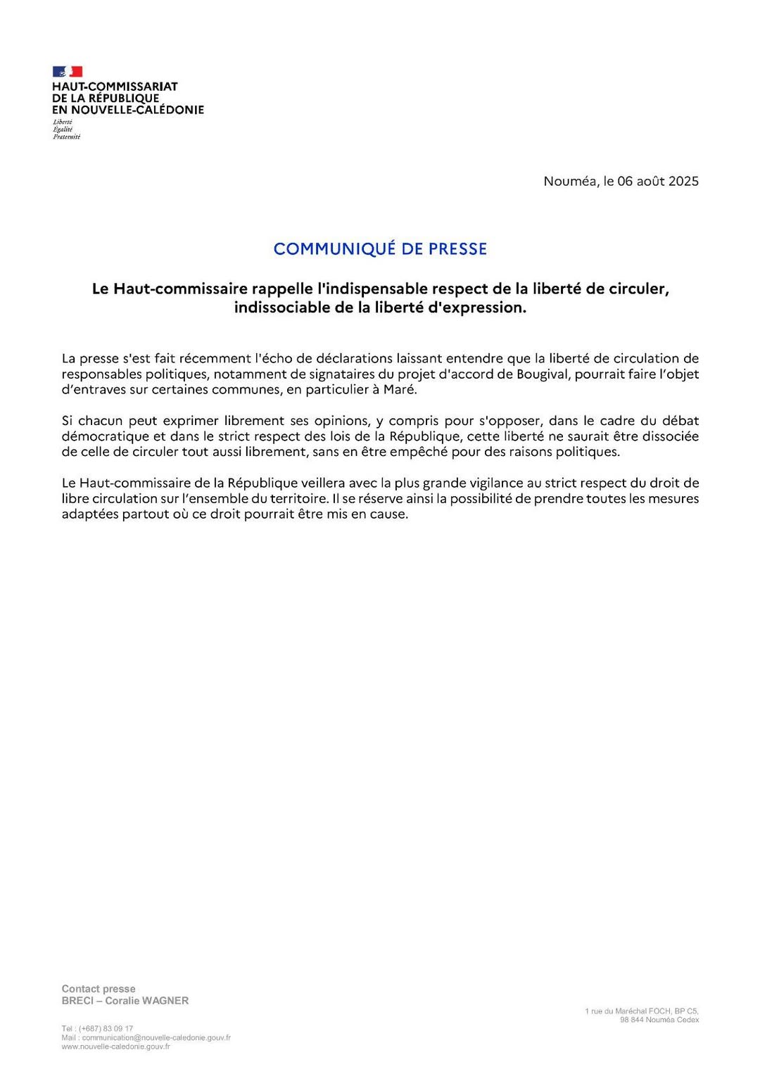 Face à cette situation explosive, le Haut-commissaire de la République en Nouvelle-Calédonie a publié un communiqué officiel, ce mercredi 6 août 2025. Le représentant de l’État y rappelle avec force que la liberté de circulation est un principe constitutionnel, indissociable de la liberté d’expression.