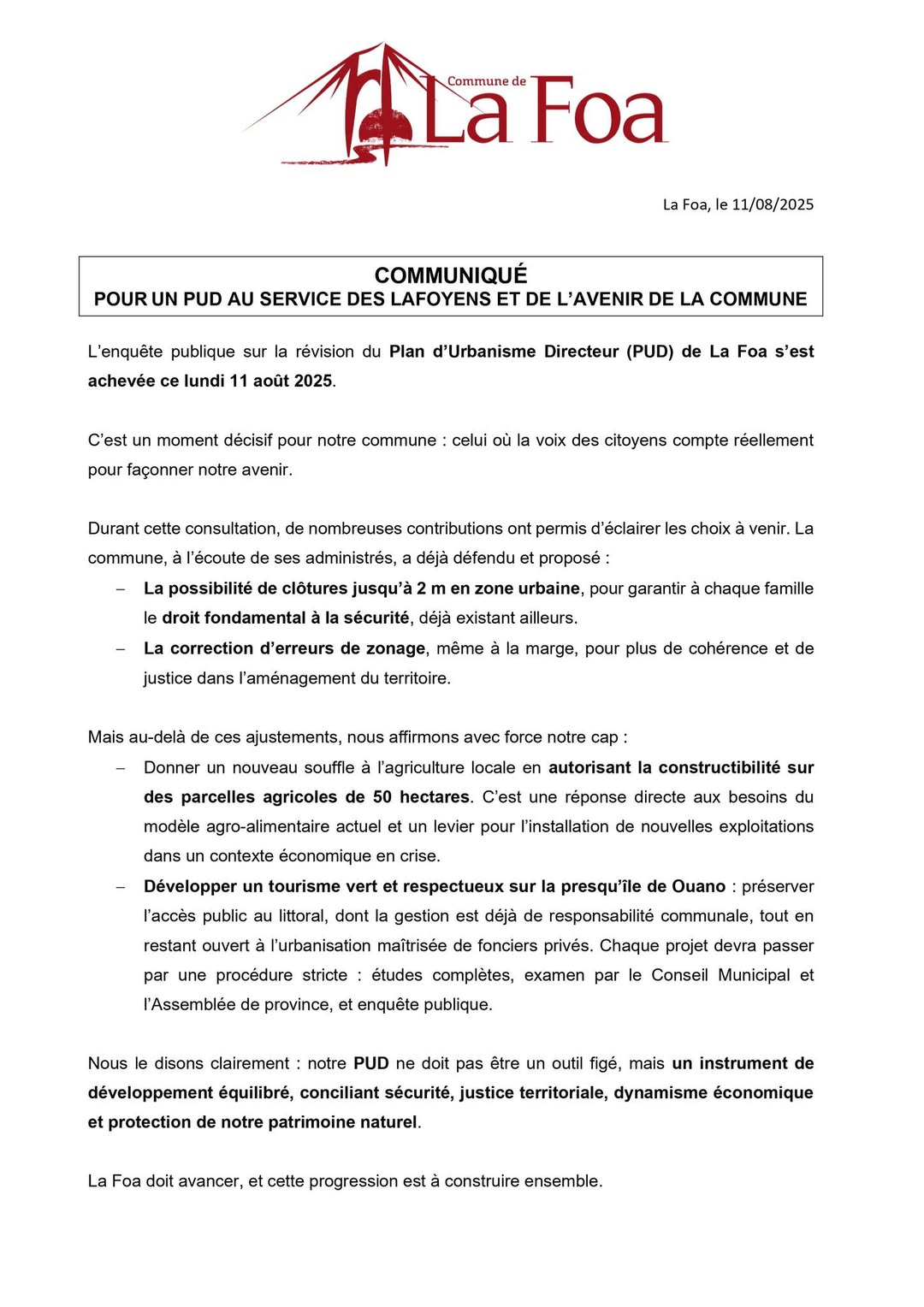 Deux annonces fortes viennent de sceller la révision du PUD de La Foa : la sécurité des habitants et le développement économique ne seront plus des options, mais des priorités.