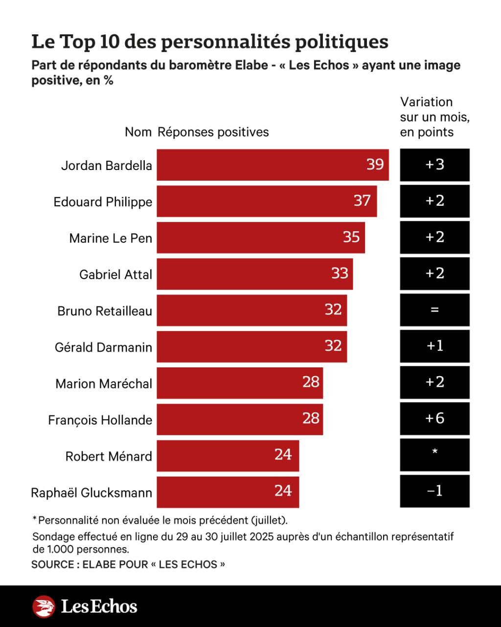 Ce baromètre, réalisé en ligne les 29 et 30 juillet auprès de 1 000 personnes représentatives, met en lumière une tendance lourde : la domination de la droite nationale dans l’opinion. Bardella et Le Pen totalisent à eux deux 74 % d’images positives cumulées. Le reste du paysage se contente de suivre, quand il ne sombre pas dans l’anonymat.