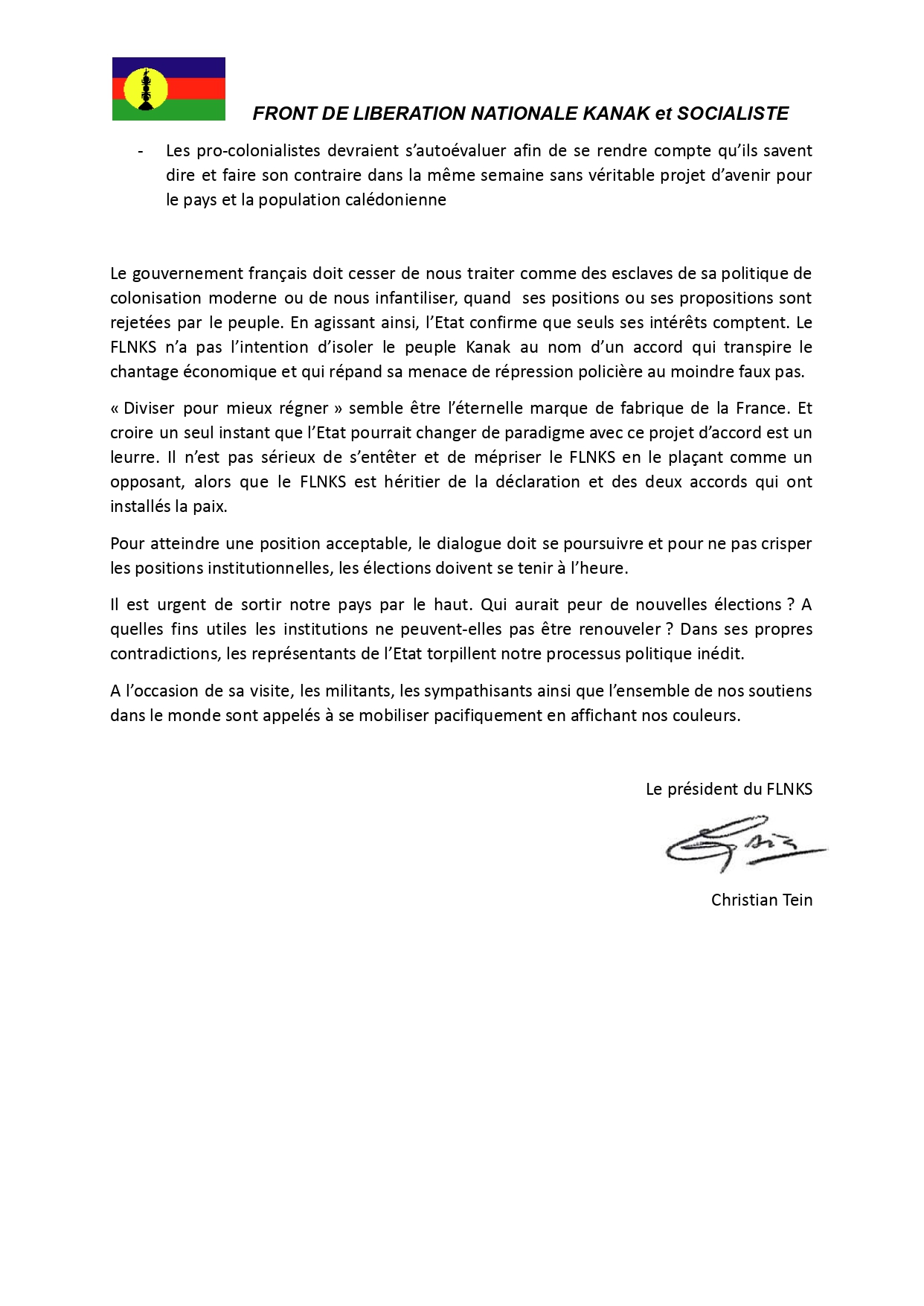 Le communiqué, au ton victimaire, multiplie les références historiques : de la déclaration de Nainvilles-les-Roches en 1983 aux accords de Matignon et de Nouméa, le FLNKS se présente comme héritier de la paix, tout en soufflant sur les braises de la division. Le paradoxe est saisissant.