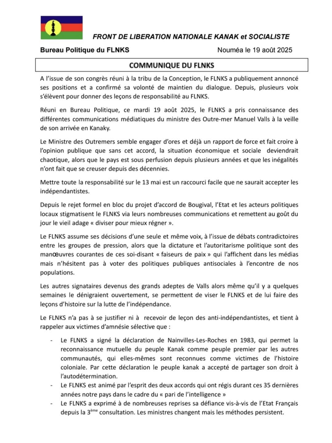 Ce mardi 19 août, à quelques heures de l’arrivée de Manuel Valls en Nouvelle-Calédonie, le président du FLNKS a diffusé un communiqué au vitriol. Il dénonce une prétendue stigmatisation du front indépendantiste, tout en accusant l’État français de « diviser pour mieux régner ». Cette rhétorique, vieille comme la politique coloniale, revient sans cesse dans le discours indépendantiste. Mais les faits sont têtus : c’est bien le FLNKS qui a rejeté le projet d’accord de Bougival, préférant camper sur une position de refus permanent.