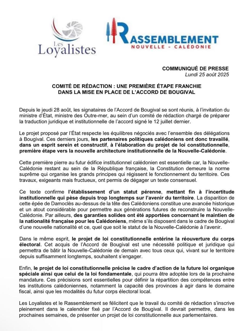Les Loyalistes et le Rassemblement saluent que ce travail s’inscrive pleinement dans le calendrier prévu par l’Accord de Bougival. Prochaine étape : la présentation du projet de loi constitutionnelle aux parlementaires, dans les délais annoncés. La machine institutionnelle avance. Mais sans le FLNKS, qui persiste à s’isoler, au risque de voir l’avenir du territoire se redessiner sans lui.