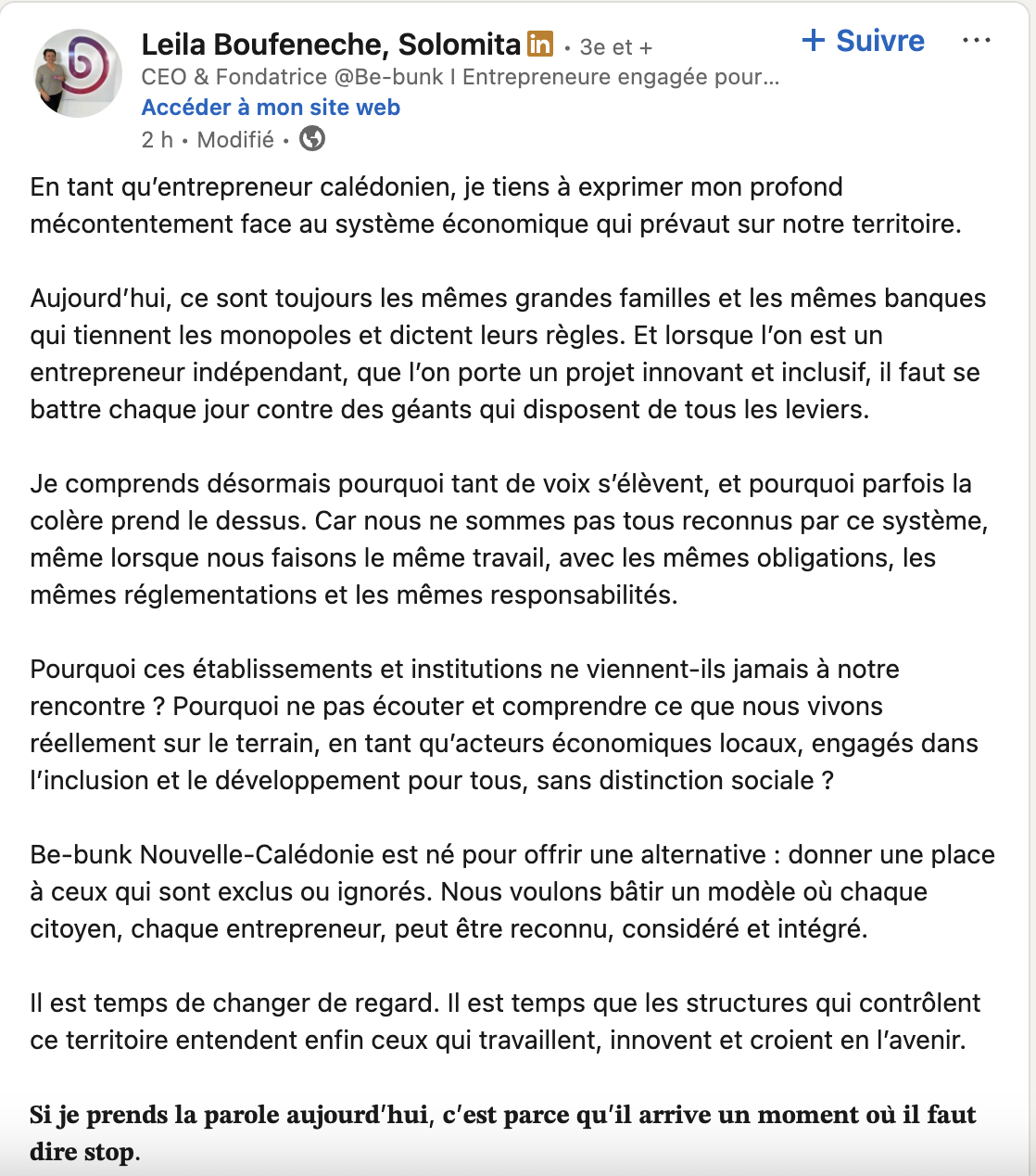 Mais dans l’opinion publique, le message suscite des interrogations. Le nom Boufeneche est depuis longtemps associé à une présence dans plusieurs secteurs stratégiques de l’économie calédonienne. Dès lors, certains se demandent si la critique ne sonne pas comme une remise en cause d’un système dont on fait soi-même partie. Ce paradoxe brouille parfois le message. Pour certains, cela fragilise la posture de victime ; pour d’autres, au contraire, cela démontre que même des héritiers du système finissent par dénoncer ses dérives.