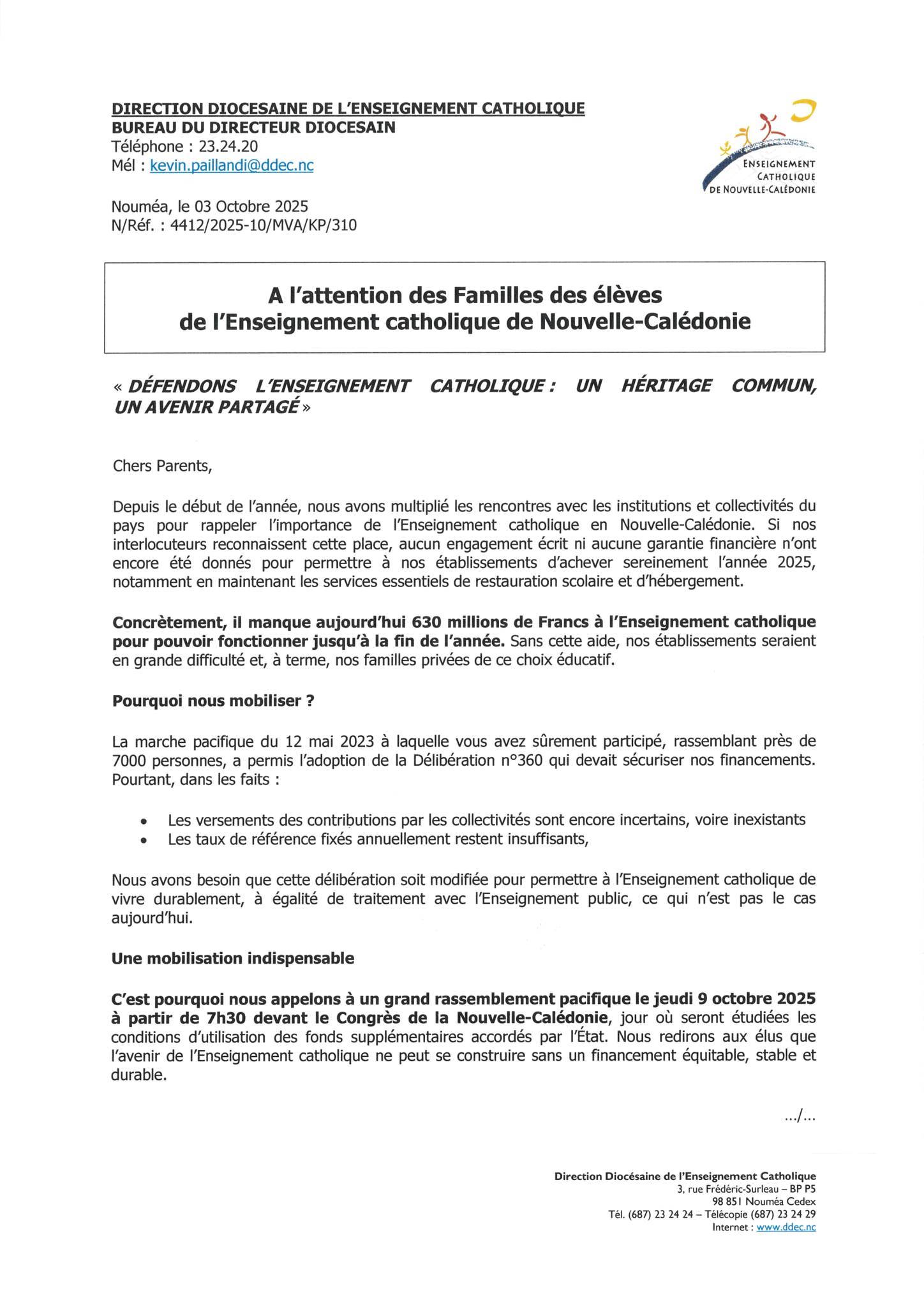 La DDEC rappelle que ses établissements assurent une mission d’intérêt général, identique à celle du public : former les enfants de Nouvelle-Calédonie, transmettre un savoir, garantir l’avenir du pays.