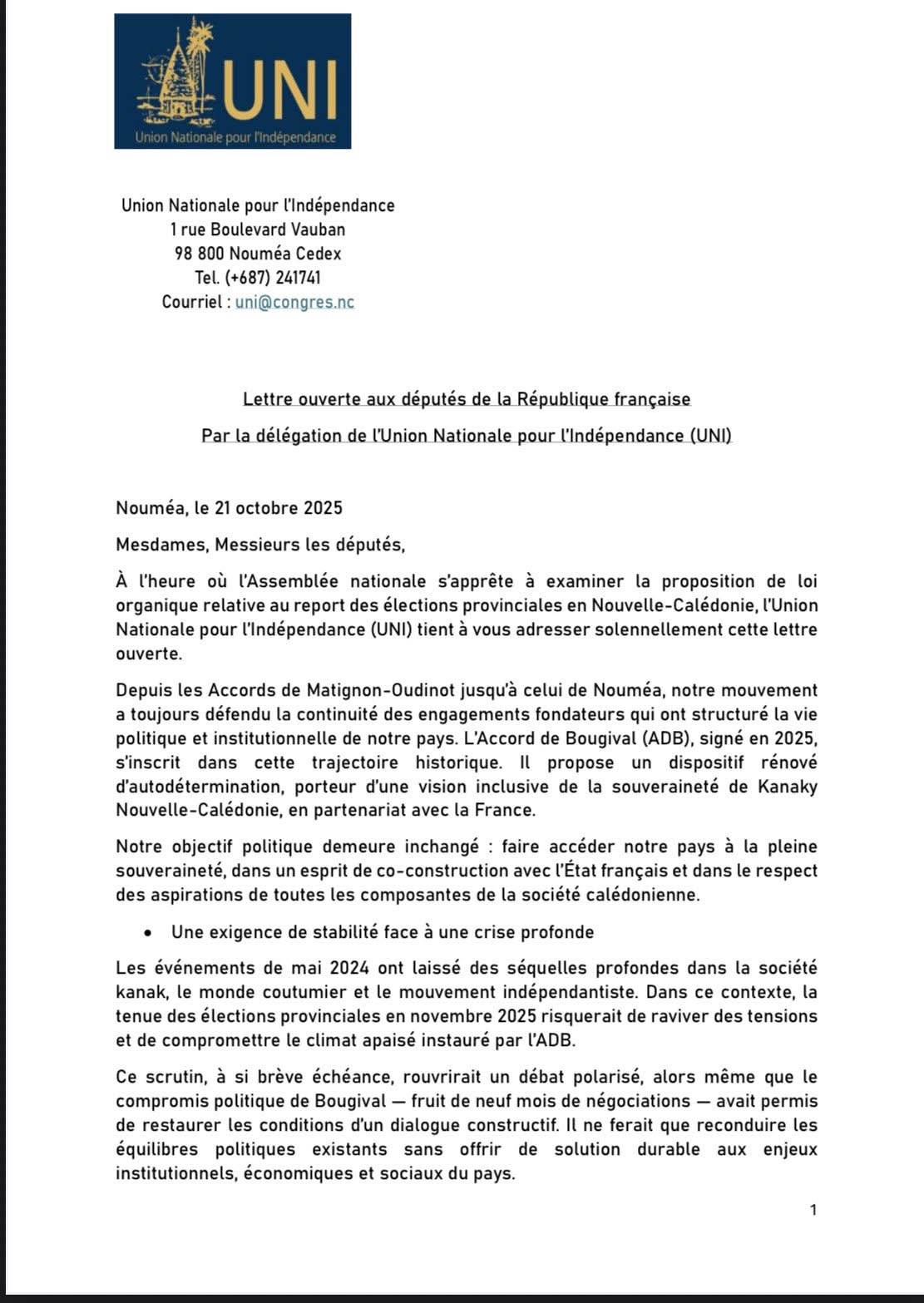 Dans une lettre ouverte adressée aux députés français, datée du 21 octobre 2025, l’Union nationale pour l’indépendance (UNI) adopte un ton grave. Alors que l’UC et une partie du FLNKS multiplient les pressions pour que les élections provinciales se tiennent avant la fin novembre, pour le mouvement d’Emmanuel Tjibaou : forcer le calendrier, c’est jouer avec la stabilité.