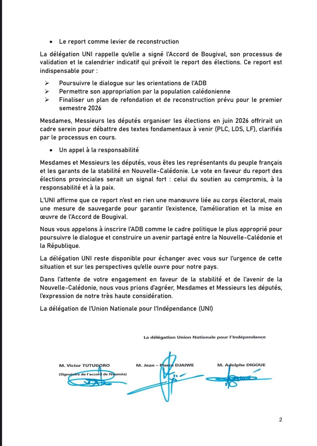 L’UNI, elle, choisit la voie de la modération. Elle rappelle que depuis les accords de Matignon-Oudinot puis celui de Nouméa, elle a toujours défendu la continuité des engagements avec la République française. Et surtout, elle inscrit sa position dans le cadre de l’accord de Bougival (ADB), signé en 2025, qui propose un dispositif rénové d’autodétermination, compatible avec une Nouvelle-Calédonie souveraine mais liée à la France.