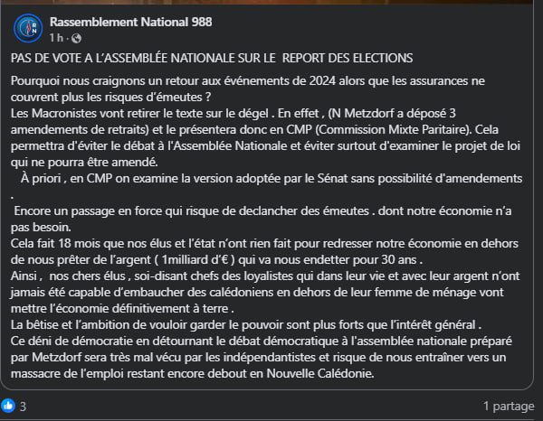 Relisons leur texte : un ton alarmiste, agressif, presque incantatoire. Une politique du ressentiment et de la menace, qui fracture le camp loyaliste au lieu de le renforcer. Le RN local ne se bat plus pour la Calédonie française, mais contre les autres loyalistes. C’est la définition même de la politique de la rancune.