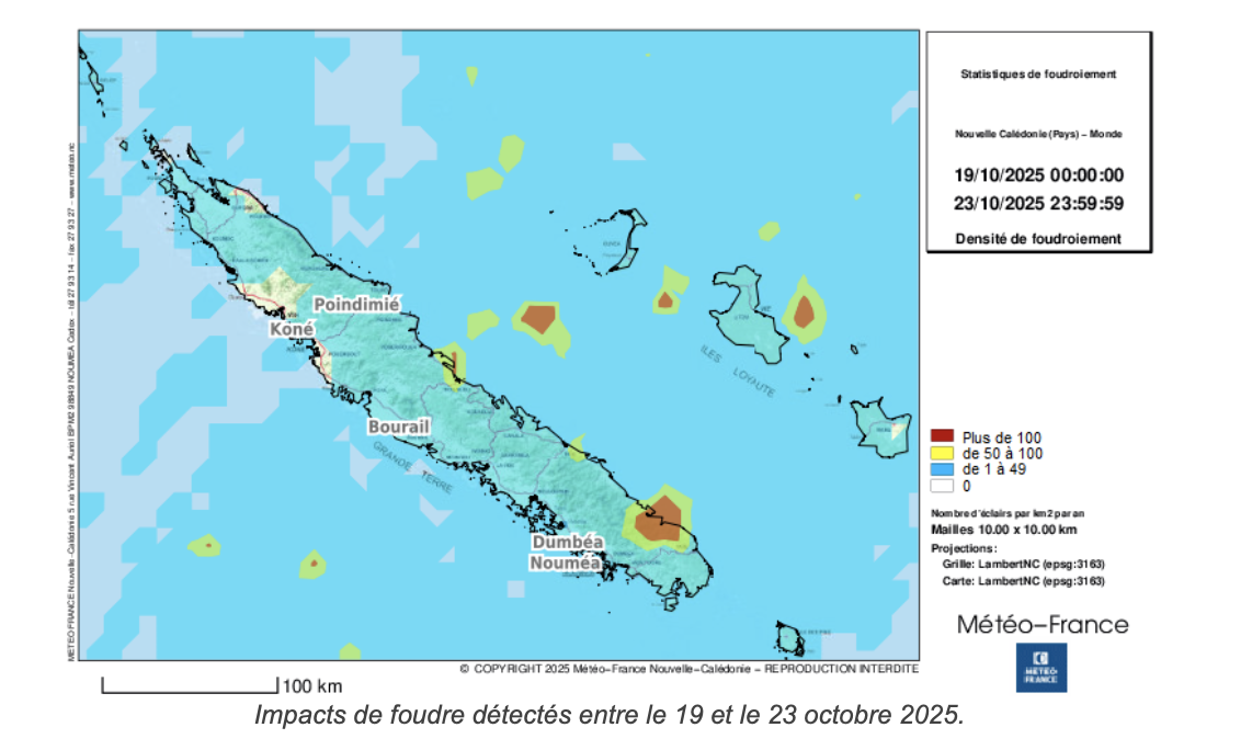 Cinq jours de pluie, des records battus, des éclairs par milliers. Météo-France Nouvelle-Calédonie dresse un bilan précis de l’épisode pluvio-orageux qui a frappé le territoire du dimanche 19 au jeudi 23 octobre 2025. Un phénomène hors norme pour un mois d’octobre, marqué par des précipitations diluviennes et une activité électrique d’une rare intensité.