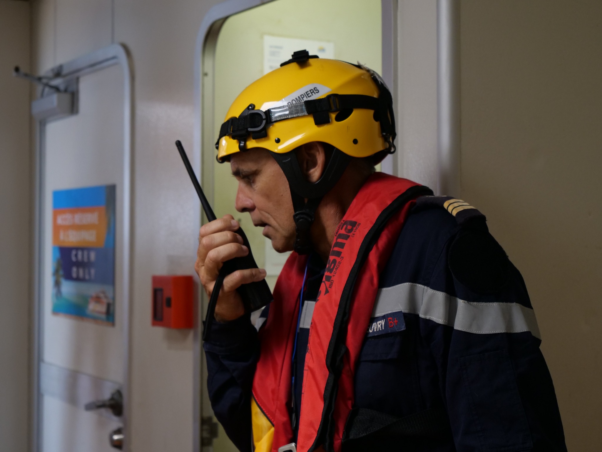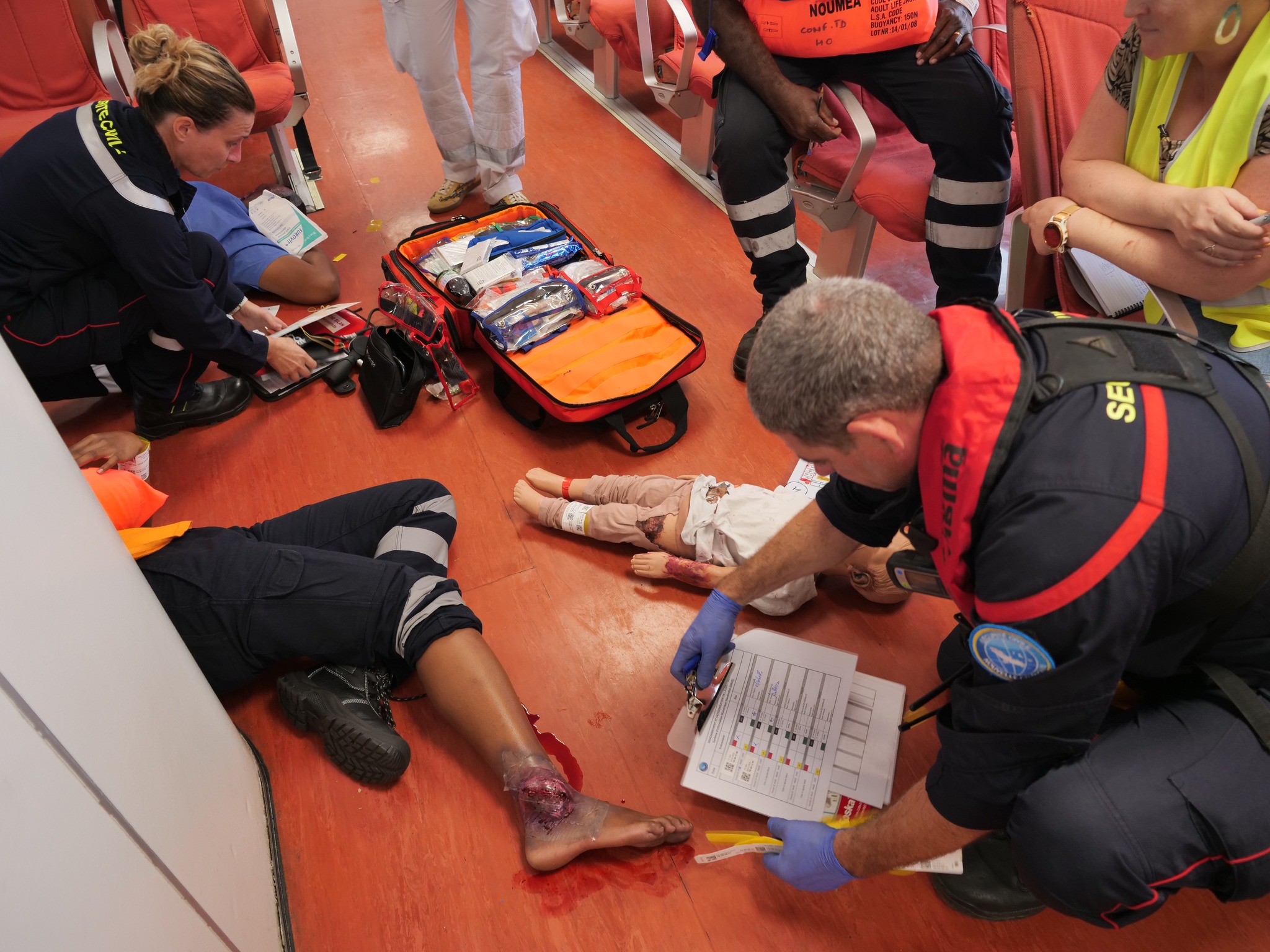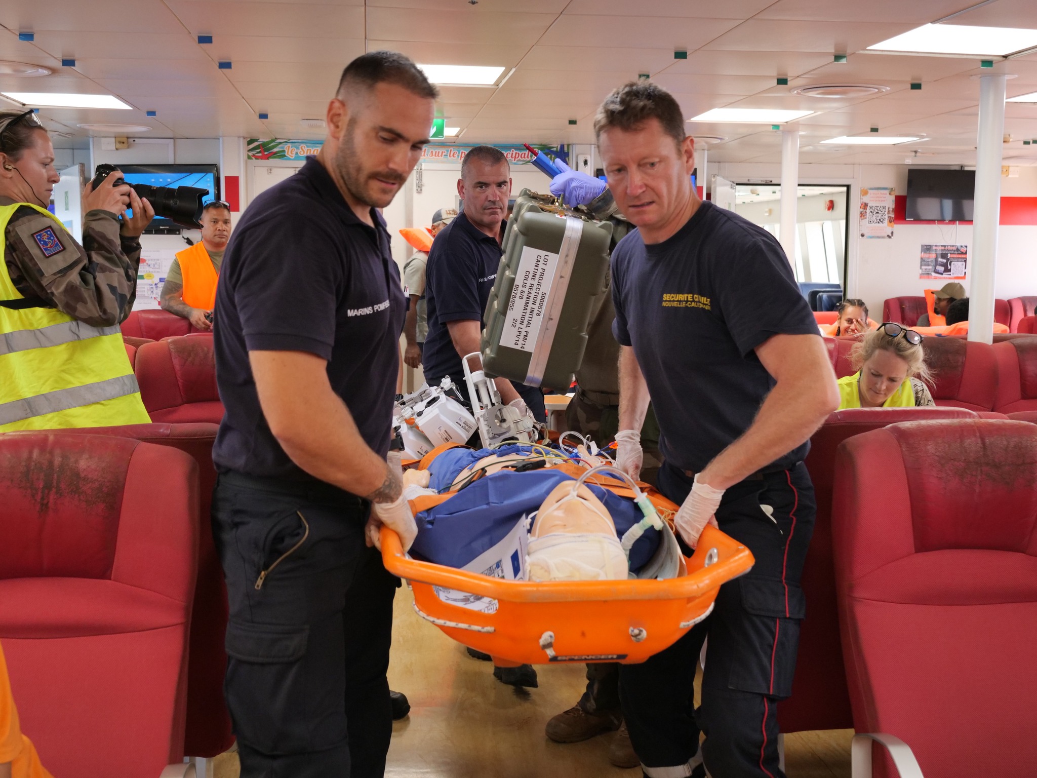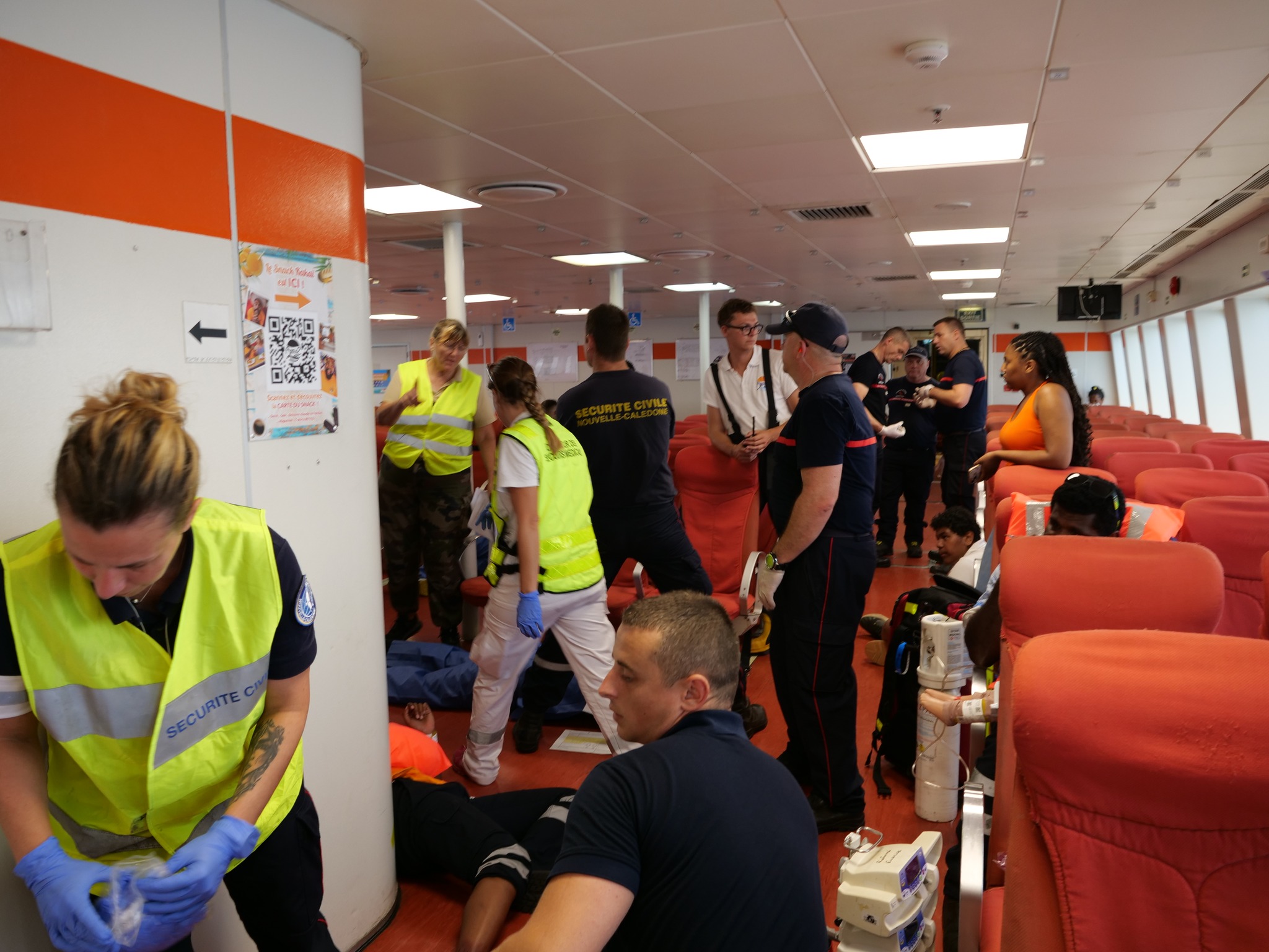Dès l’alerte donnée, la DSCGR a activé son centre opérationnel de gestion de crise (COG 988) et déclenché le plan “nombreuses victimes”, véritable colonne vertébrale du dispositif de secours terrestre. Pendant que le navire “prenait feu”, huit sapeurs-pompiers spécialisés dans la lutte contre les feux embarqués ont été héliportés par un Puma des Forces armées de Nouvelle-Calédonie (FANC) directement sur le bâtiment.