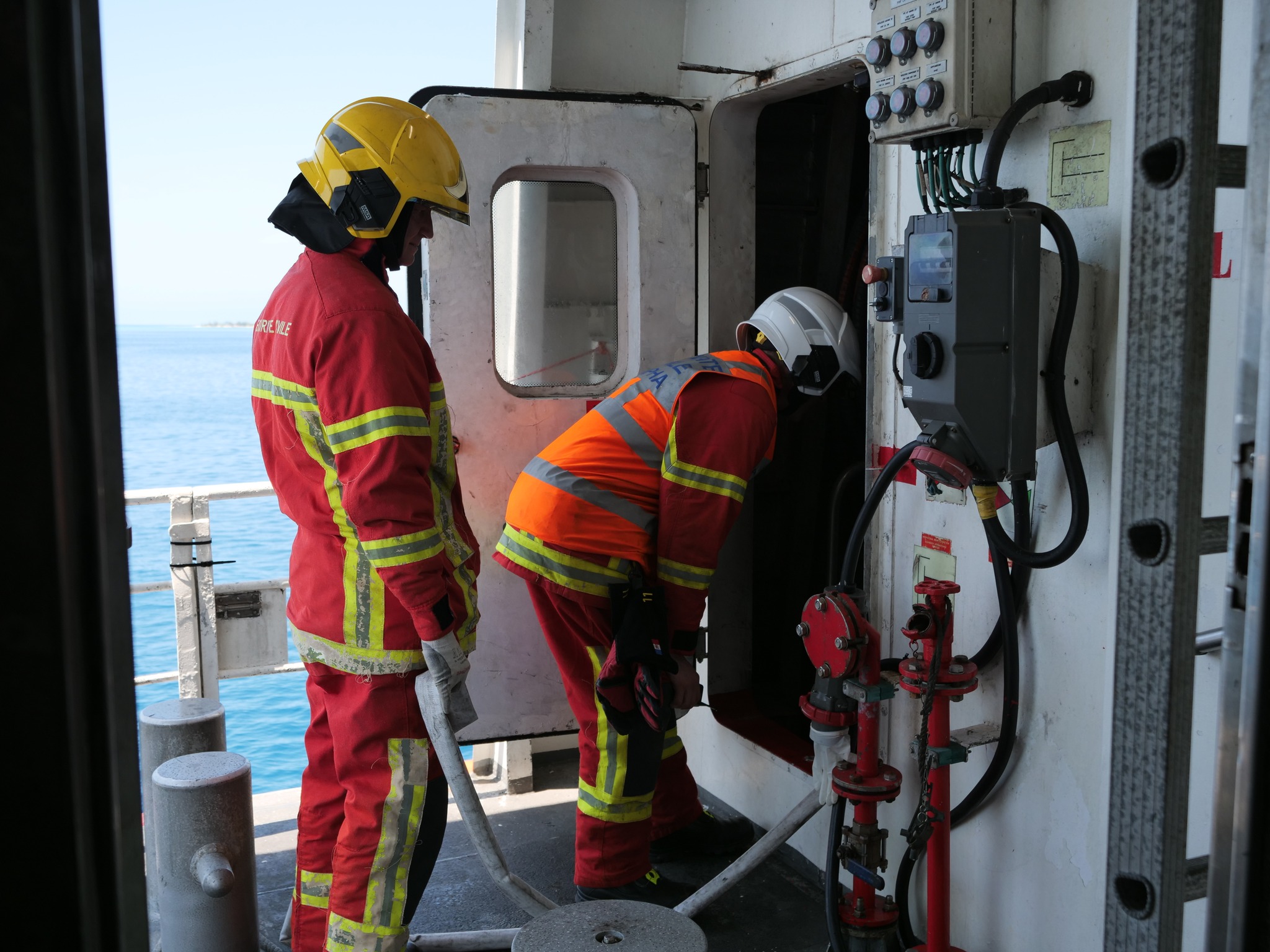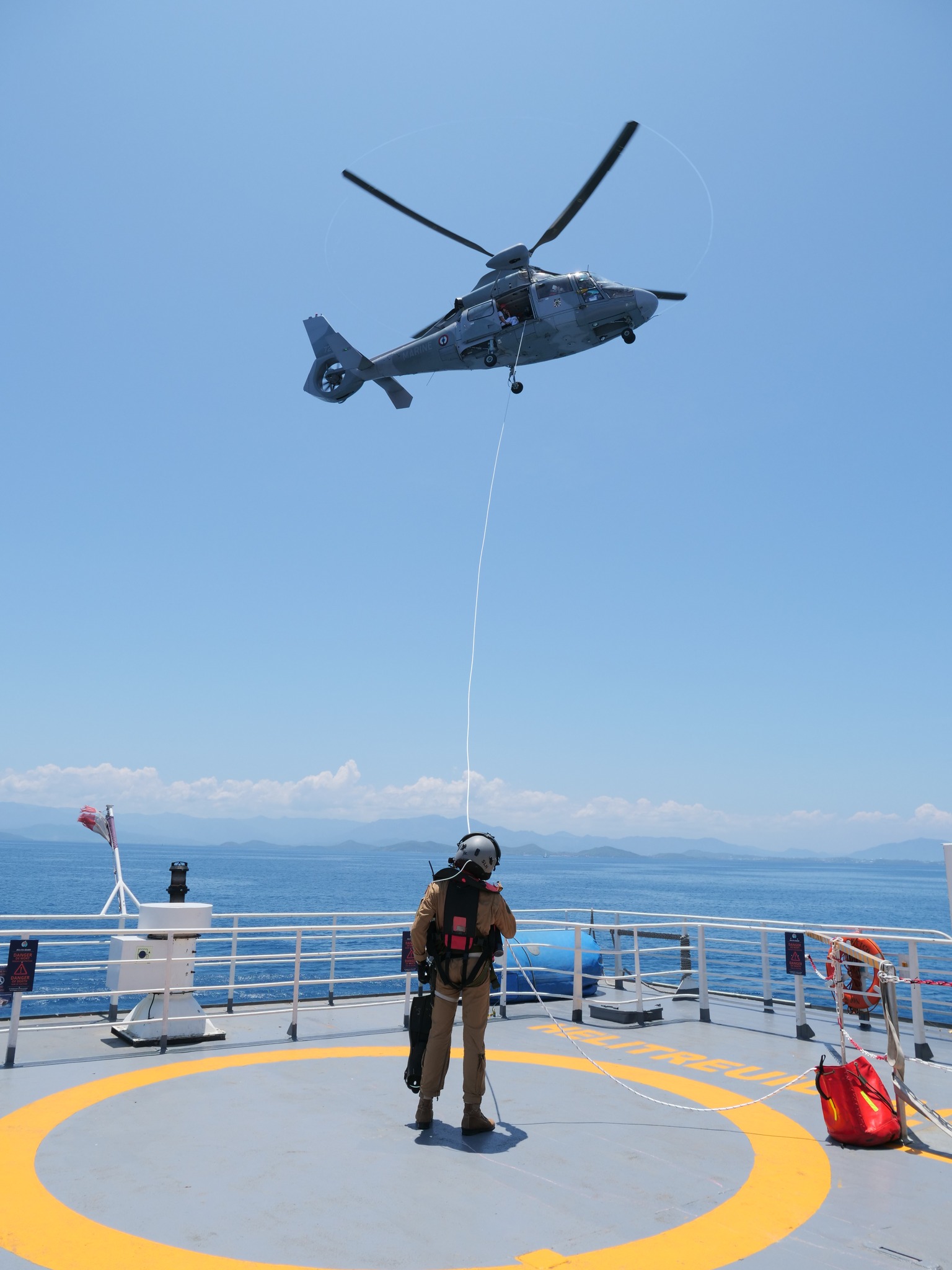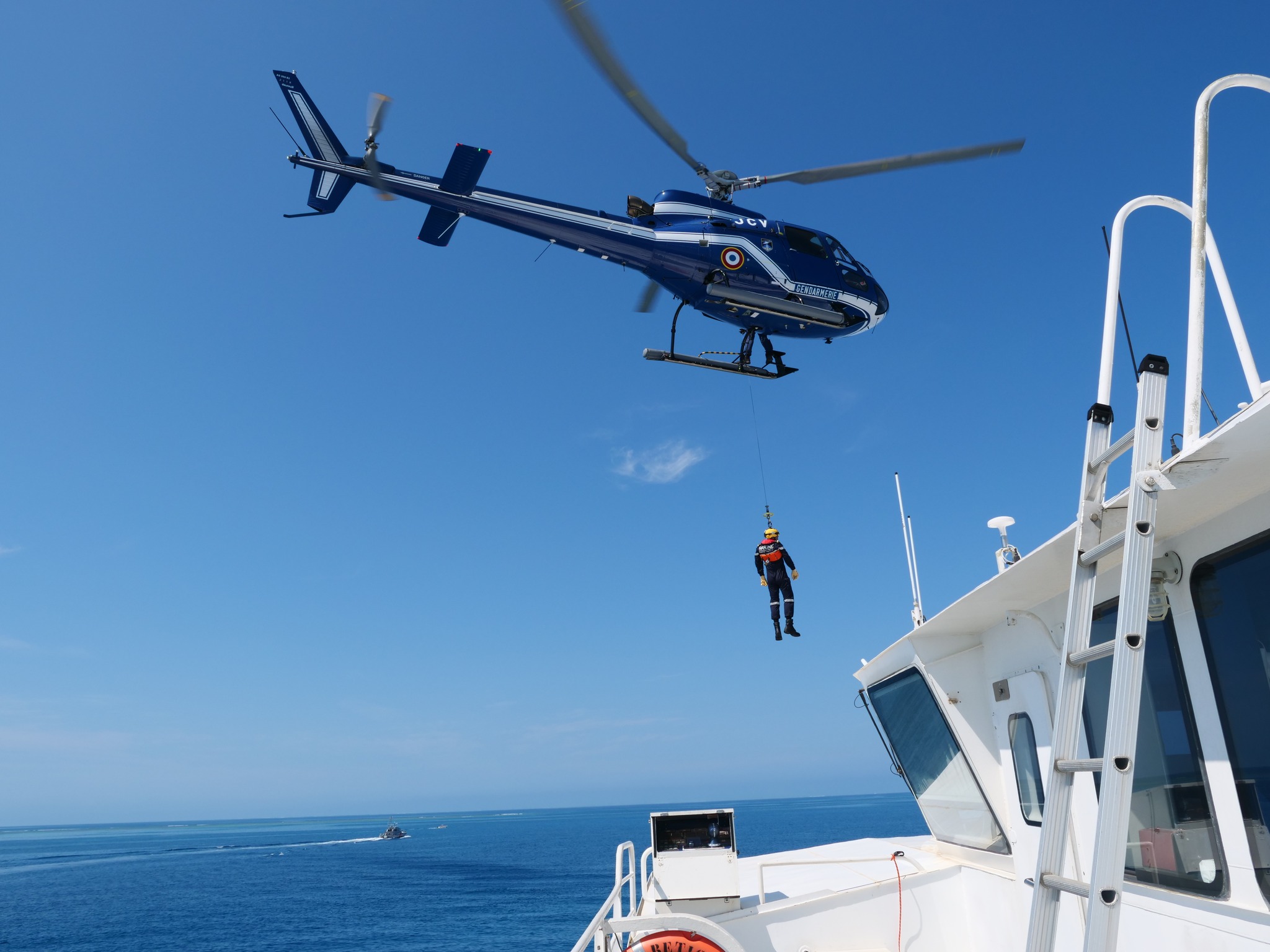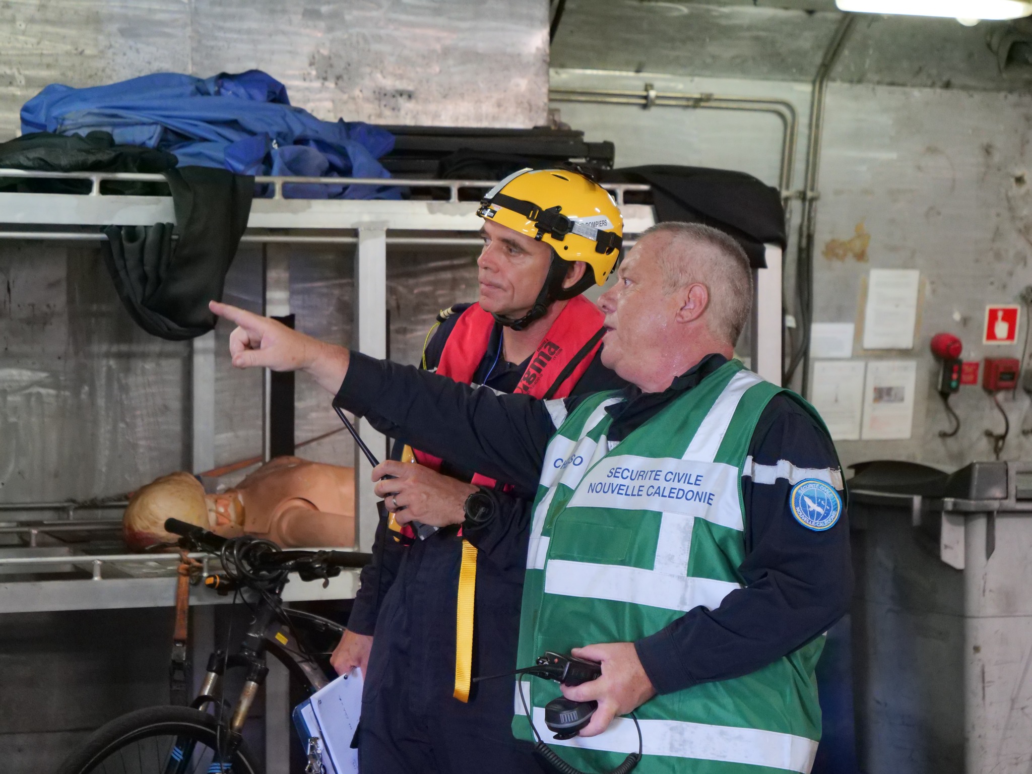 Dès l’alerte donnée, la DSCGR a activé son centre opérationnel de gestion de crise (COG 988) et déclenché le plan “nombreuses victimes”, véritable colonne vertébrale du dispositif de secours terrestre. Pendant que le navire “prenait feu”, huit sapeurs-pompiers spécialisés dans la lutte contre les feux embarqués ont été héliportés par un Puma des Forces armées de Nouvelle-Calédonie (FANC) directement sur le bâtiment.