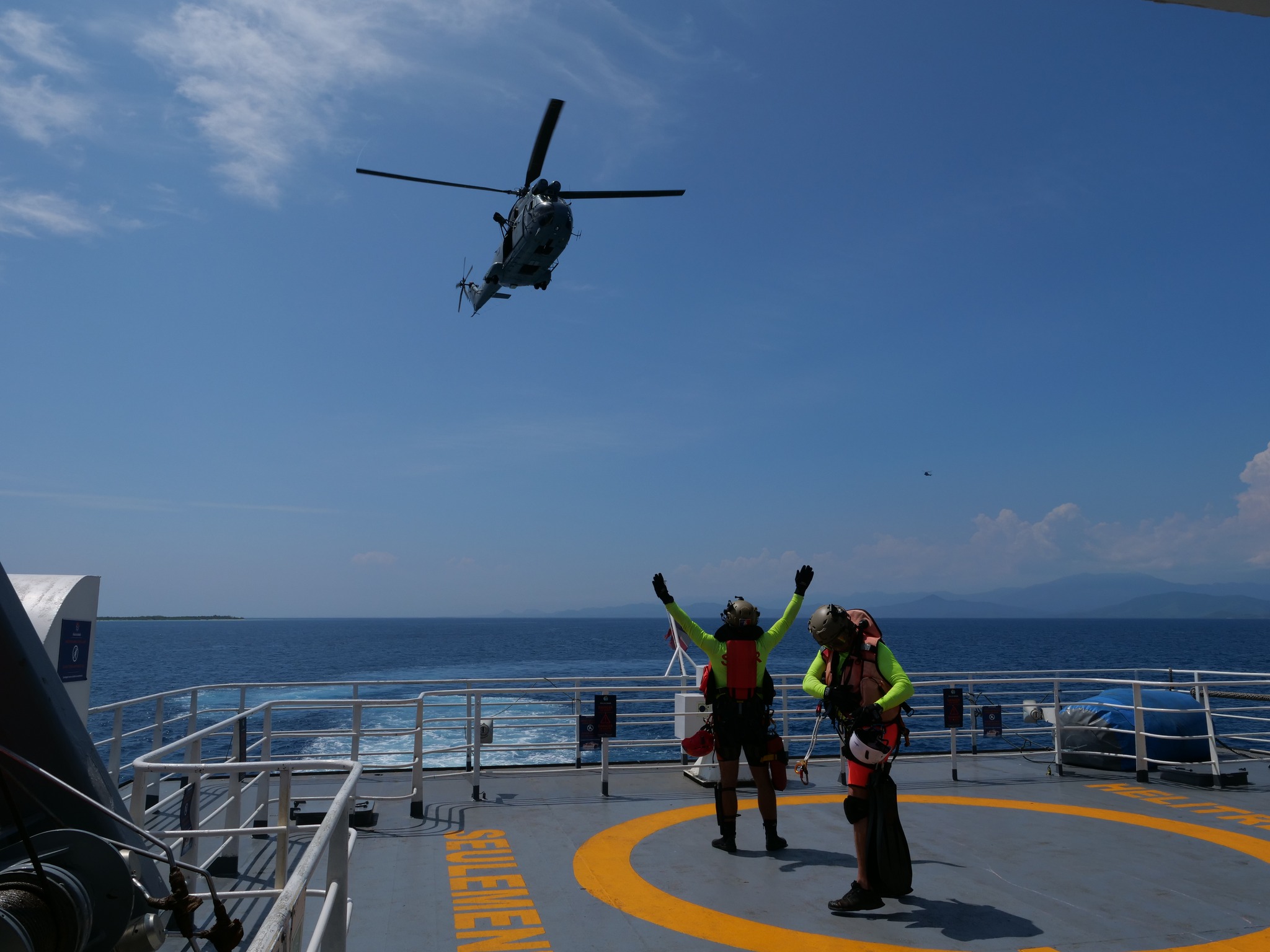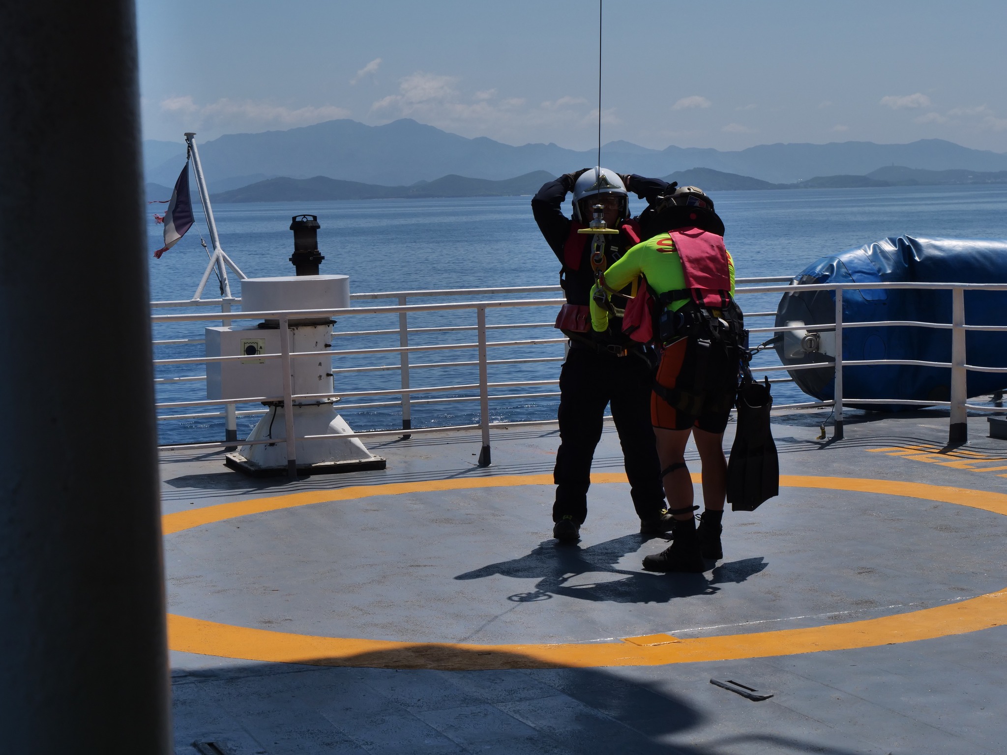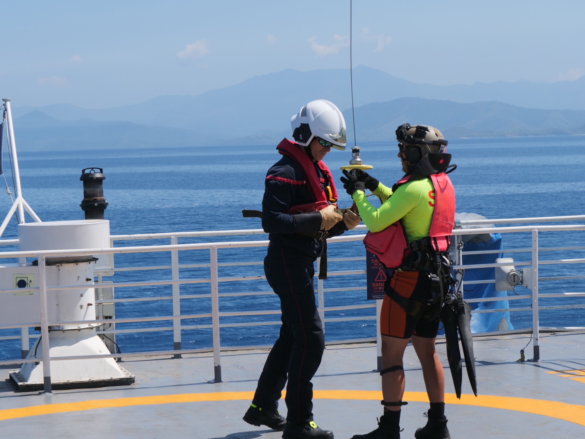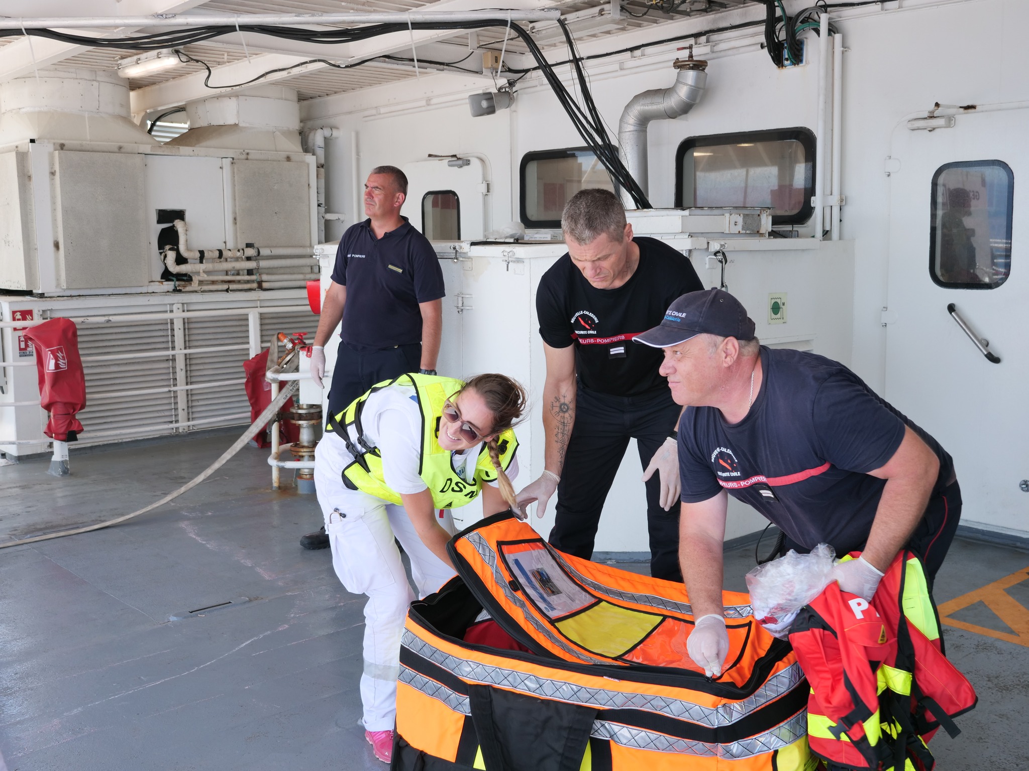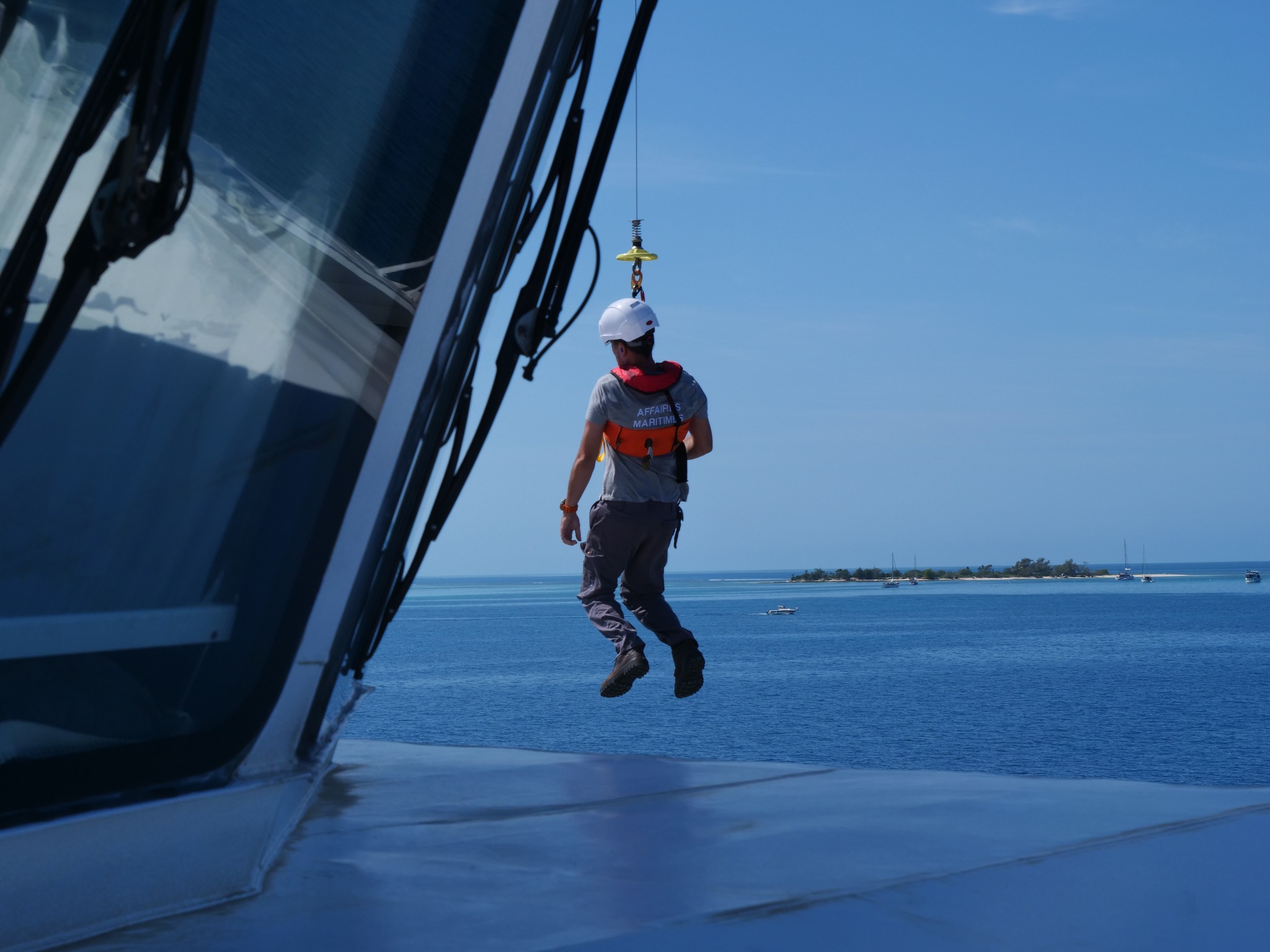 Dès l’alerte donnée, la DSCGR a activé son centre opérationnel de gestion de crise (COG 988) et déclenché le plan “nombreuses victimes”, véritable colonne vertébrale du dispositif de secours terrestre. Pendant que le navire “prenait feu”, huit sapeurs-pompiers spécialisés dans la lutte contre les feux embarqués ont été héliportés par un Puma des Forces armées de Nouvelle-Calédonie (FANC) directement sur le bâtiment.