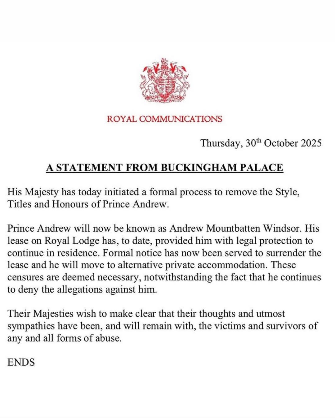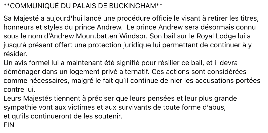 Sa Majesté a entamé aujourd’hui une procédure officielle pour retirer le titre, les honneurs et le prédicat du prince Andrew, annonce le communiqué royal.