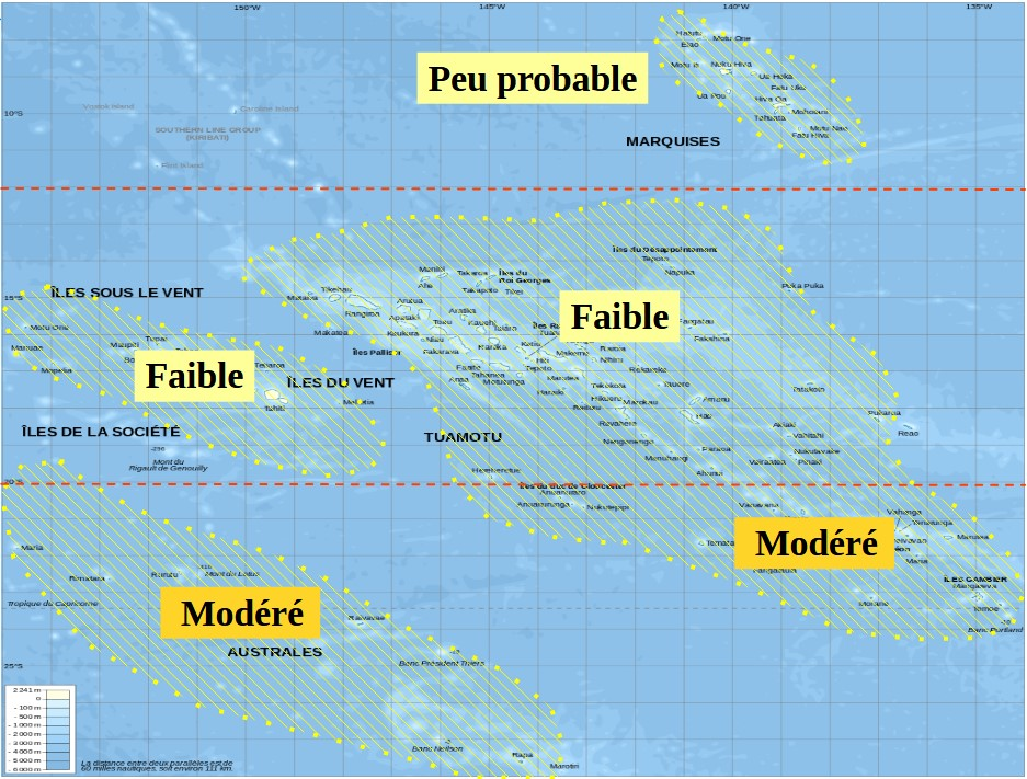 Sur les Marquises, les chances de voir se développer un phénomène cyclonique nommé demeurent très faibles. Entre 12°S et 20°S, c’est-à-dire dans une large zone incluant une partie des Tuamotu et la Société, l’activité potentielle reste faible.