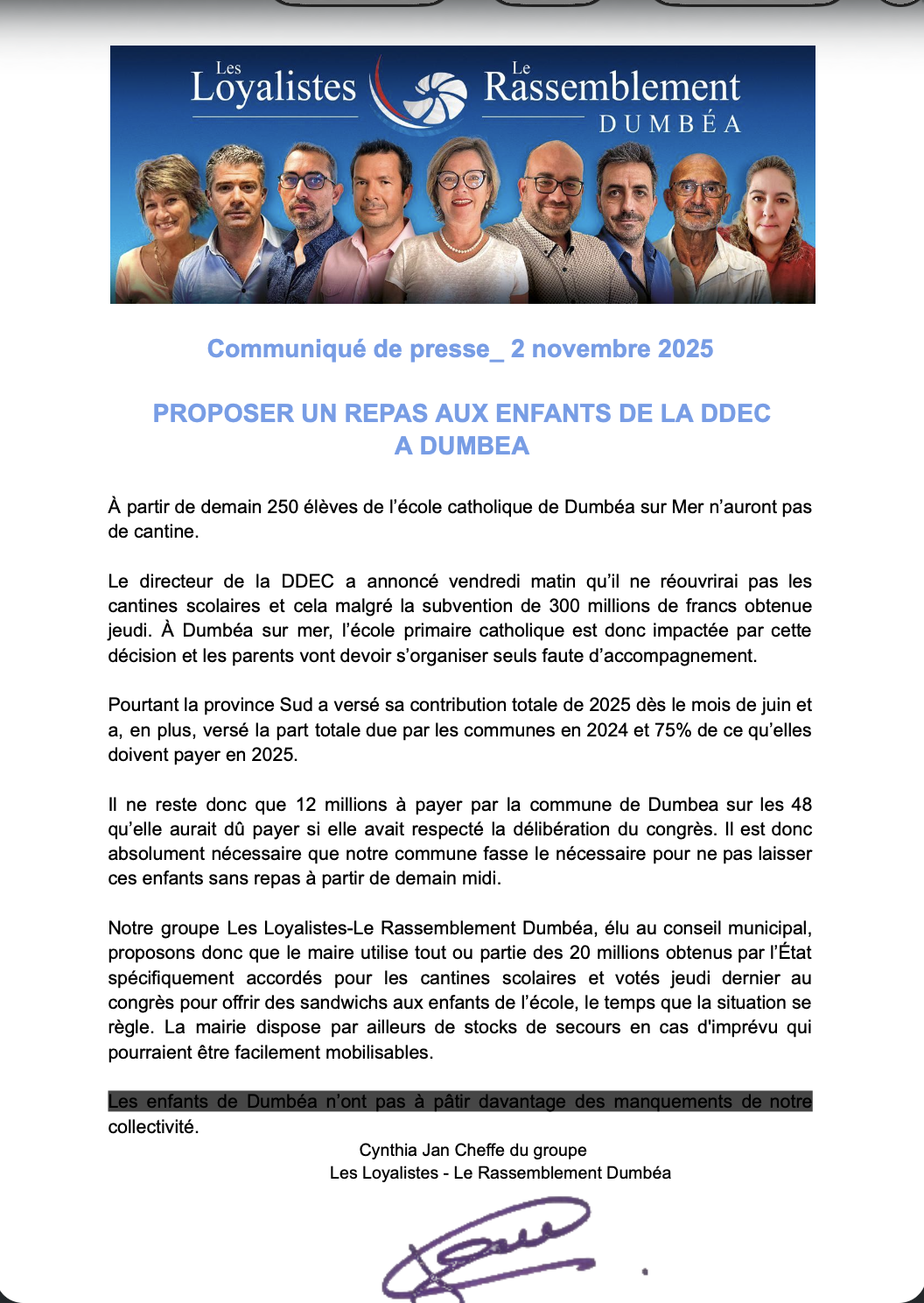 La DDEC suspend entre autres la cantine à Dumbéa mais également sur l'ensemble d'autres communes malgré 300 millions versés. Les Loyalistes appellent la mairie à réagir d’urgence.