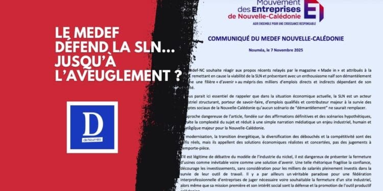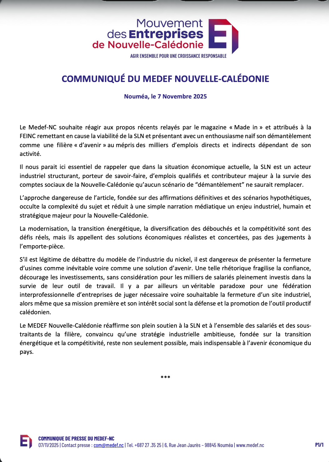 Le communiqué du MEDEF Nouvelle-Calédonie, publié le 7 novembre 2025, n’est pas passé inaperçu. En s’en prenant à la FEINC (Fédération des entreprises interprofessionnelles de Nouvelle-Calédonie) pour avoir évoqué la possible fin de la SLN, le patronat local s’est posé en gardien du statu quo industriel. Mais à trop vouloir défendre un modèle à bout de souffle, le MEDEF risque d’étouffer un débat pourtant nécessaire : celui de la reconversion et de l’adaptation d’un secteur en crise structurelle.