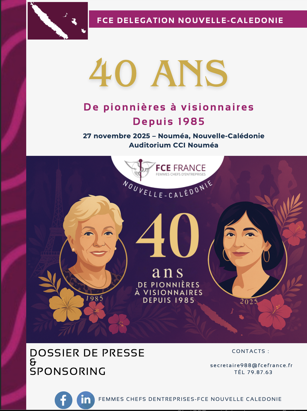 Quarante ans d’engagement, de solidarité et de leadership féminin : c’est ce que célèbrent cette année les Femmes Chefs d’Entreprises (FCE) Nouvelle-Calédonie. Le 27 novembre 2025, l’auditorium de la CCI accueillera une matinée d’échanges placée sous le thème “De pionnières à visionnaires”, suivie d’un après-midi de rencontres professionnelles et de visites d’entreprises membres. Une date symbolique pour un réseau qui, depuis 1985, fait progresser la place des femmes dans l’économie calédonienne.