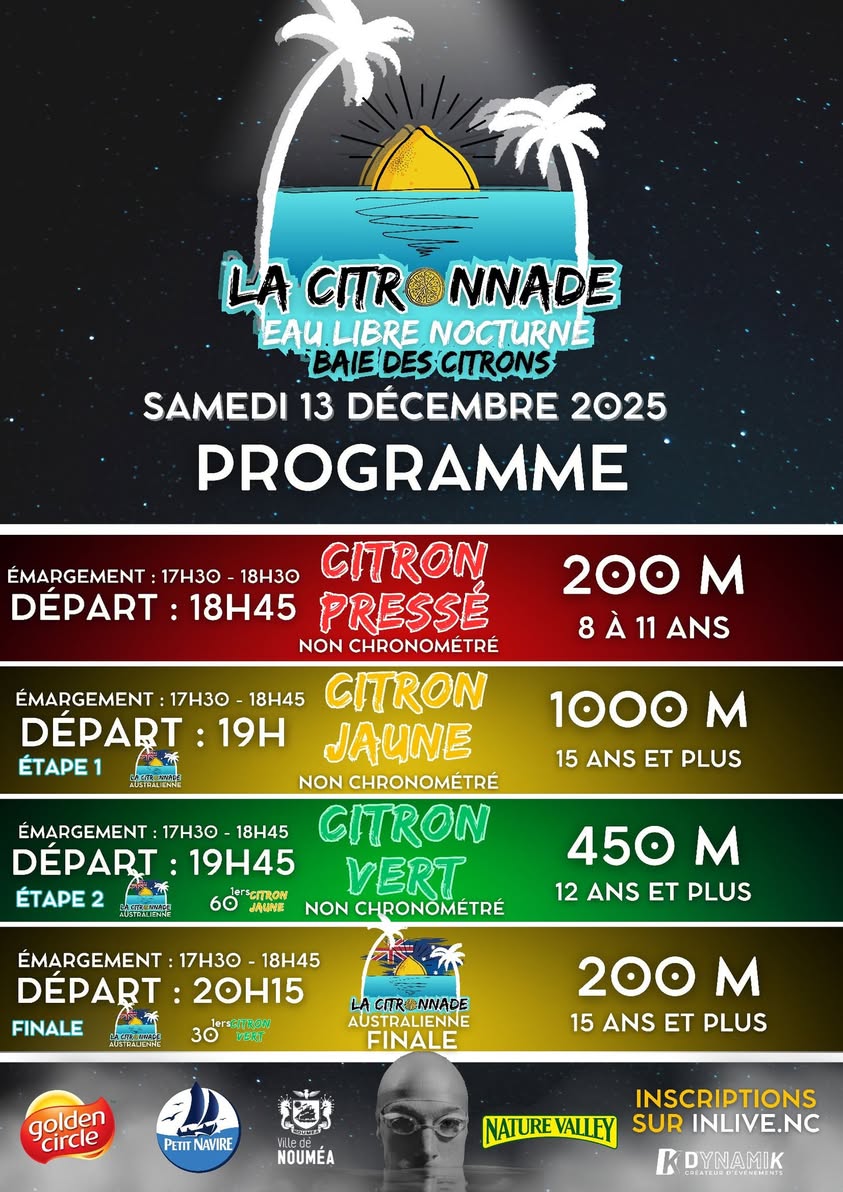 Le vendredi 13 décembre 2025, l’association Dynamik NC tiendra la troisième édition de la Citronnade, un événement de nage en eau libre nocturne organisé dans le périmètre sécurisé de la Baie des Citrons. Cette épreuve, loin des dérives du sport-spectacle déresponsabilisé, s’inscrit dans une logique de discipline, de sécurité et de dépassement de soi. Les inscriptions sont officiellement ouvertes via la plateforme InLive.nc, avec une clôture fixée au mercredi 11 décembre à minuit.