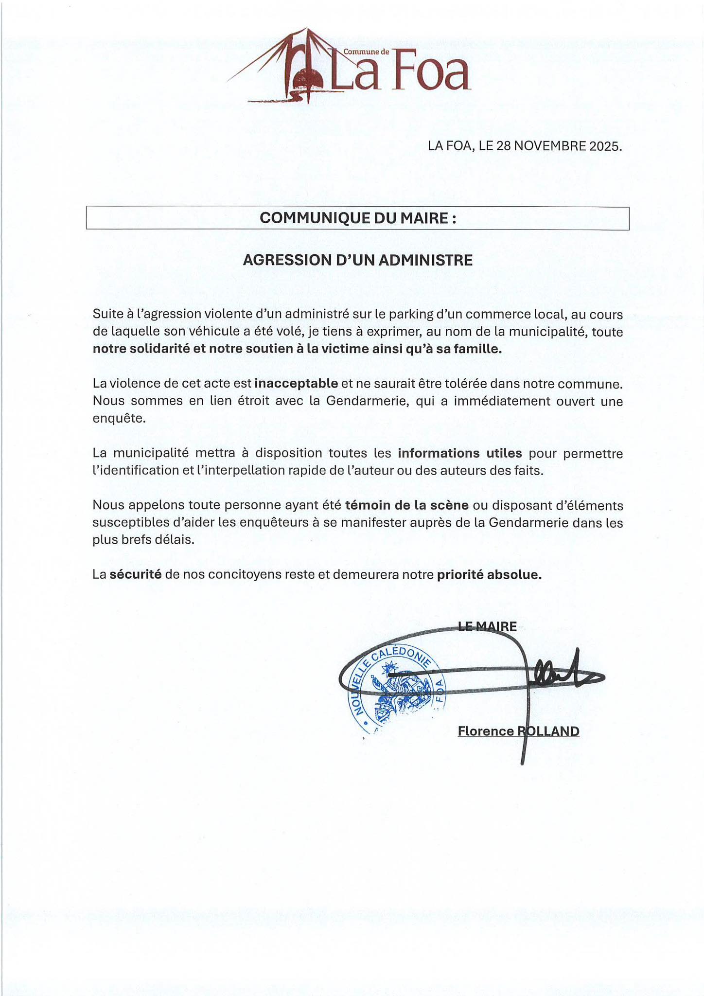 Dans un communiqué solennel, la maire Florence Rolland exprime la solidarité de la municipalité envers la victime et sa famille, rappelant que la violence de cet acte est « inacceptable » et « ne saurait être tolérée » à La Foa. La municipalité assure travailler « en lien étroit » avec la Gendarmerie, immédiatement mobilisée.