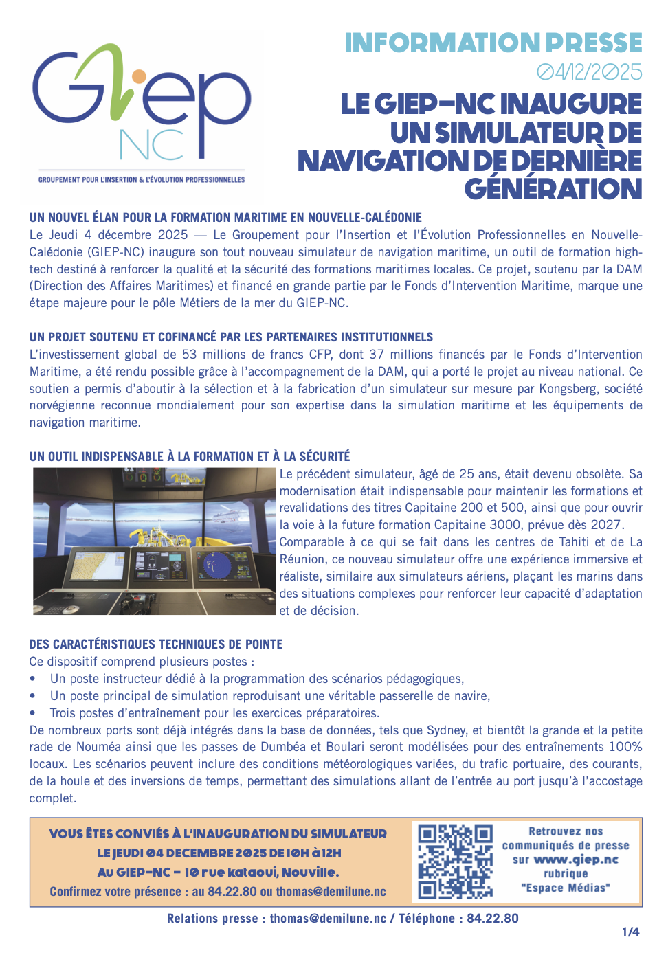 Avec cet outil dernier cri, la Nouvelle-Calédonie espère devenir un hub de formation maritime dans le Pacifique. Le GIEP-NC rappelle que des territoires comme le Vanuatu ou Wallis ne disposent pas encore d’un tel équipement, et que leur accueil renforcerait « la coopération régionale et la position de la Calédonie comme pôle de référence » .