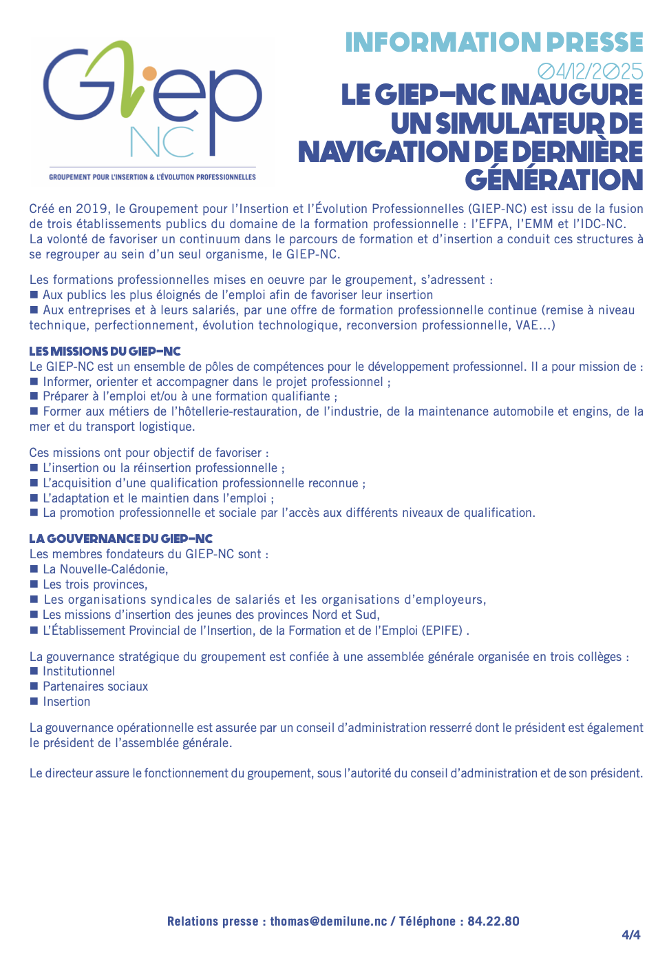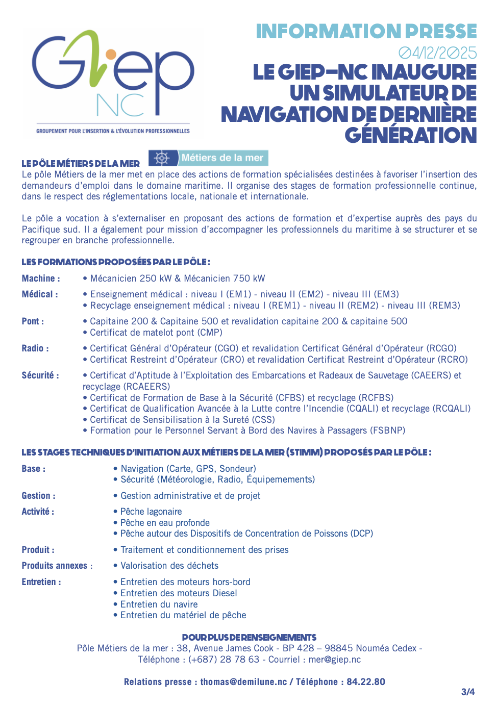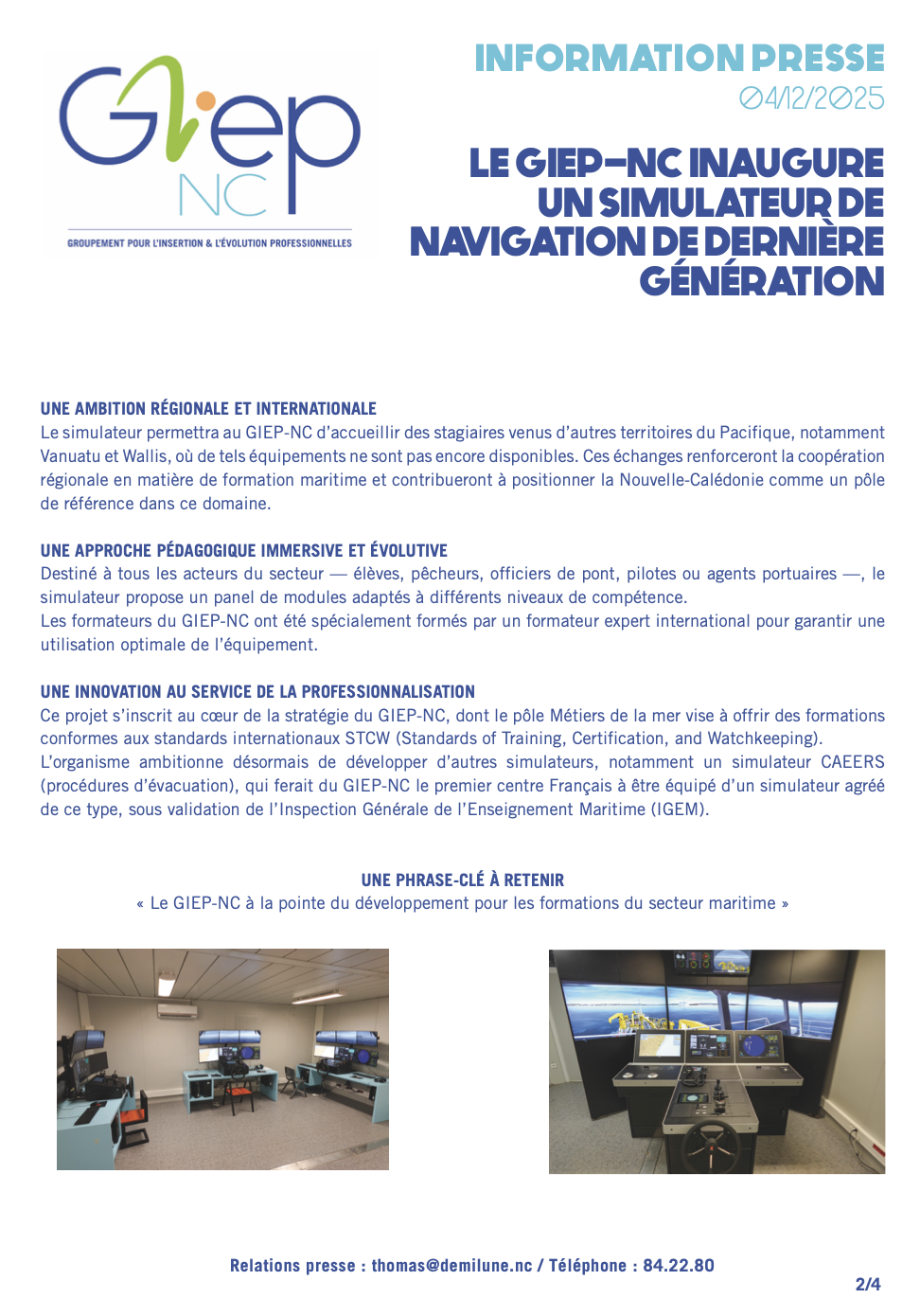 L’organisme envisage déjà la suite : un simulateur CAEERS (évacuation), qui pourrait faire du GIEP-NC le premier centre français équipé d’un simulateur agréé de ce type, après validation de l’Inspection générale de l’Enseignement maritime.
