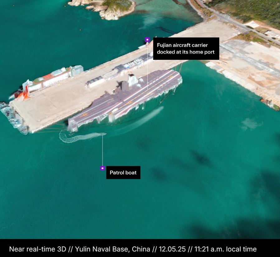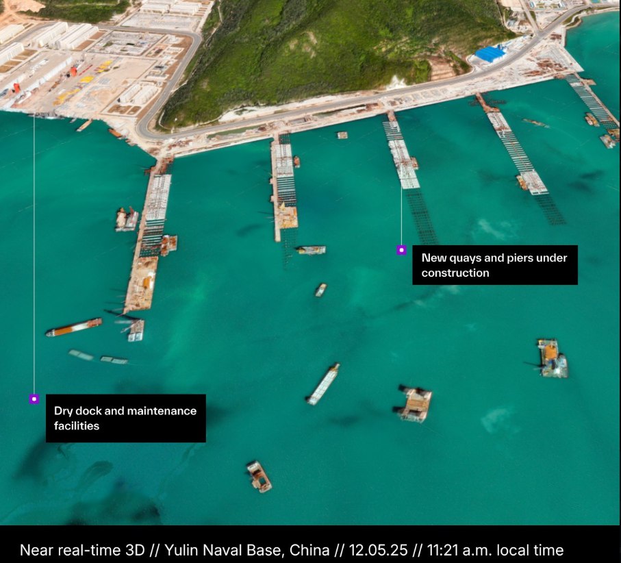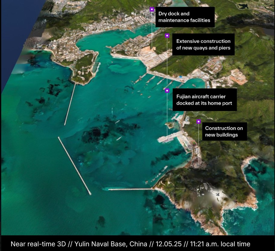 Au même moment, les images satellites du site de Yulin, sur l’île de Hainan, montrent l’absence du Shandong, signe de son déploiement en mer de Chine méridionale, tandis que le nouveau-né Fujian reste à quai. Les travaux d’extension en cours sur la base confirment que Pékin prépare sa flotte à opérer plus loin, plus longtemps, avec une logistique renforcée.