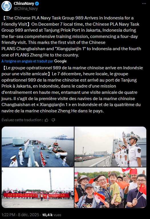 Alors que certains groupes chinois rentrent à la base après des missions prolongées comme la 47e flottille d’escorte ou le destroyer Anshan, d’autres poursuivent une véritable tournée diplomatique maritime, à l’image du groupe mené par le Changbaishan, arrivé à Jakarta après des escales au Vietnam et en Malaisie.