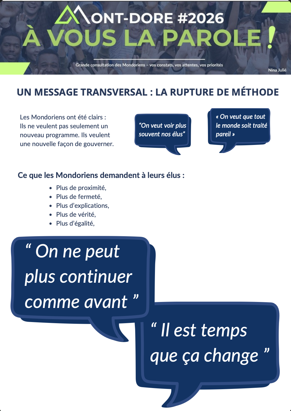 La consultation montre que les habitants souhaitent une municipalité plus proche, plus transparente, mais aussi plus ferme lorsque les règles ne sont pas respectées. Cette demande de rupture nourrit le slogan choisi pour la campagne : « Il est temps ! », emprunté aux formules spontanées des habitants eux-mêmes. L’idée est d’ouvrir une nouvelle étape, de restaurer la confiance et de replacer les Mondoriens au cœur de l’action publique.