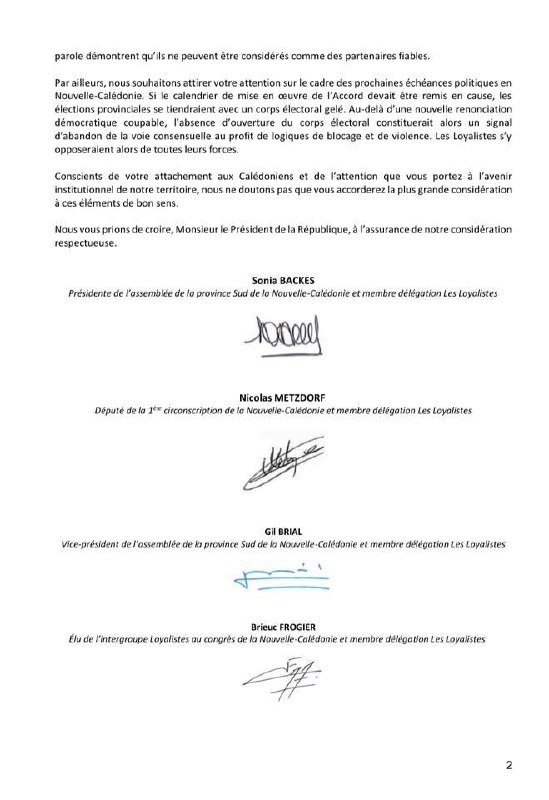 Le courrier alerte également sur les échéances électorales à venir, notamment les élections provinciales. Toute remise en cause du cadre électoral, sans corps électoral élargi ni ouverture démocratique, serait perçue comme un signal d’abandon de la voie républicaine, au profit de logiques de blocage et de confrontation.