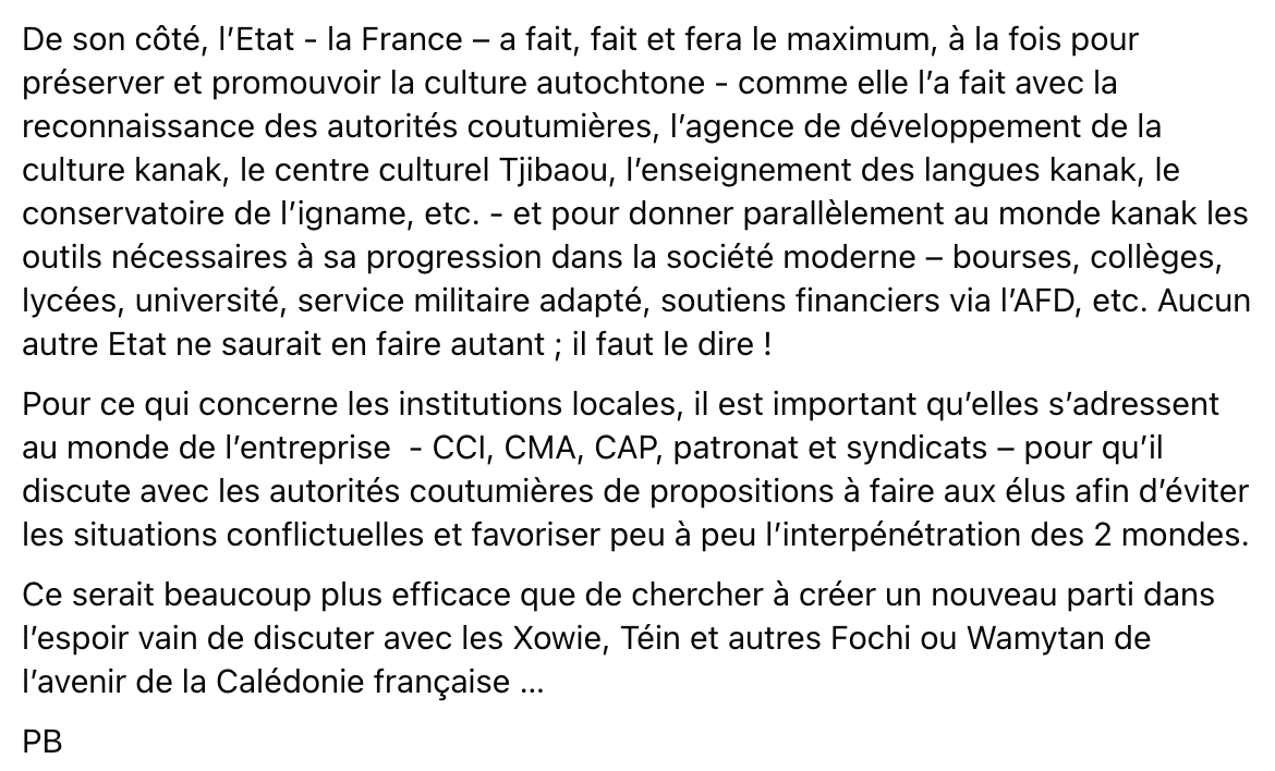 Son texte repose sur une conviction typiquement boomer : le conflit serait avant tout culturel, presque affectif. Les Kanak auraient surtout peur de perdre leur identité, et l’État français, s’il explique mieux ce qu’il fait déjà « aucun autre État ne saurait en faire autant », écrit-il, finirait par rassurer.