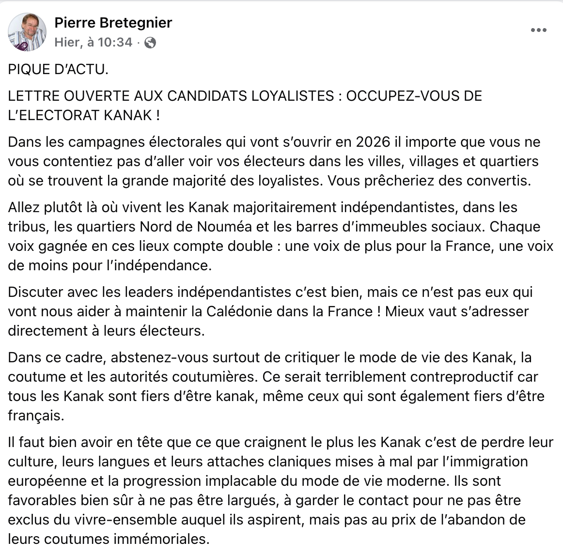 Le texte de Pierre Bretegnier circule ces jours-ci comme une lettre ouverte aux candidats loyalistes. Il se veut bienveillant, stratégique, presque pédagogique. Il appelle les futurs candidats à « s’occuper de l’électorat kanak », à sortir de leurs zones de confort, à aller discuter dans les tribus, les quartiers nord et les logements sociaux. L’intention est claire. Le ton est posé. Et le raisonnement, à première lecture, paraît frappé au coin du bon sens.