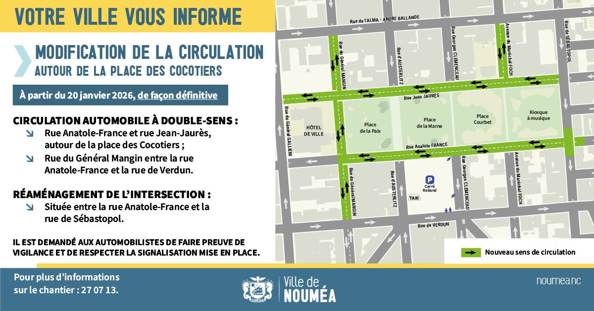 À compter du 20 janvier 2026, la circulation automobile évolue de manière significative autour de la place des Cocotiers, cœur névralgique du centre-ville de Nouméa.