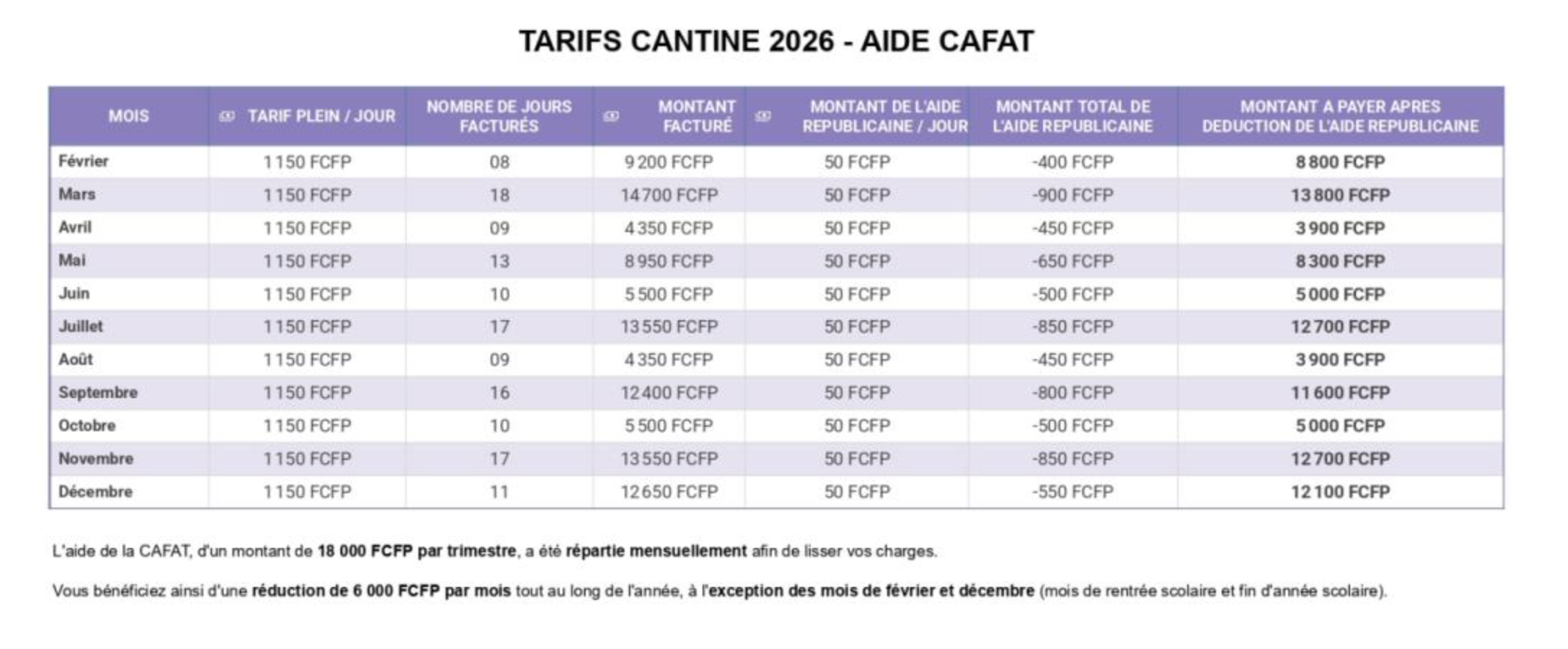 Le tarif 2026 est fixé à 1 150 francs par jour, avec des tarifs réduits pour les familles bénéficiant d’aides (bourse, Cafat), sur justificatif. Les enfants en situation de handicap ou sous PAI panier-repas bénéficient d’une réduction de 50 %.