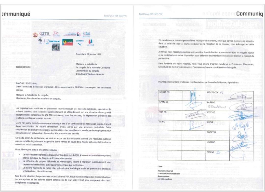 C’est un signal politique fort, rare par son ampleur. Dans un communiqué commun daté du 22 janvier 2026, les organisations syndicales et patronales représentatives de Nouvelle-Calédonie alertent solennellement la présidente et les membres du Congrès sur une situation qu’elles qualifient de « gravité exceptionnelle » concernant le 2 % FSH.