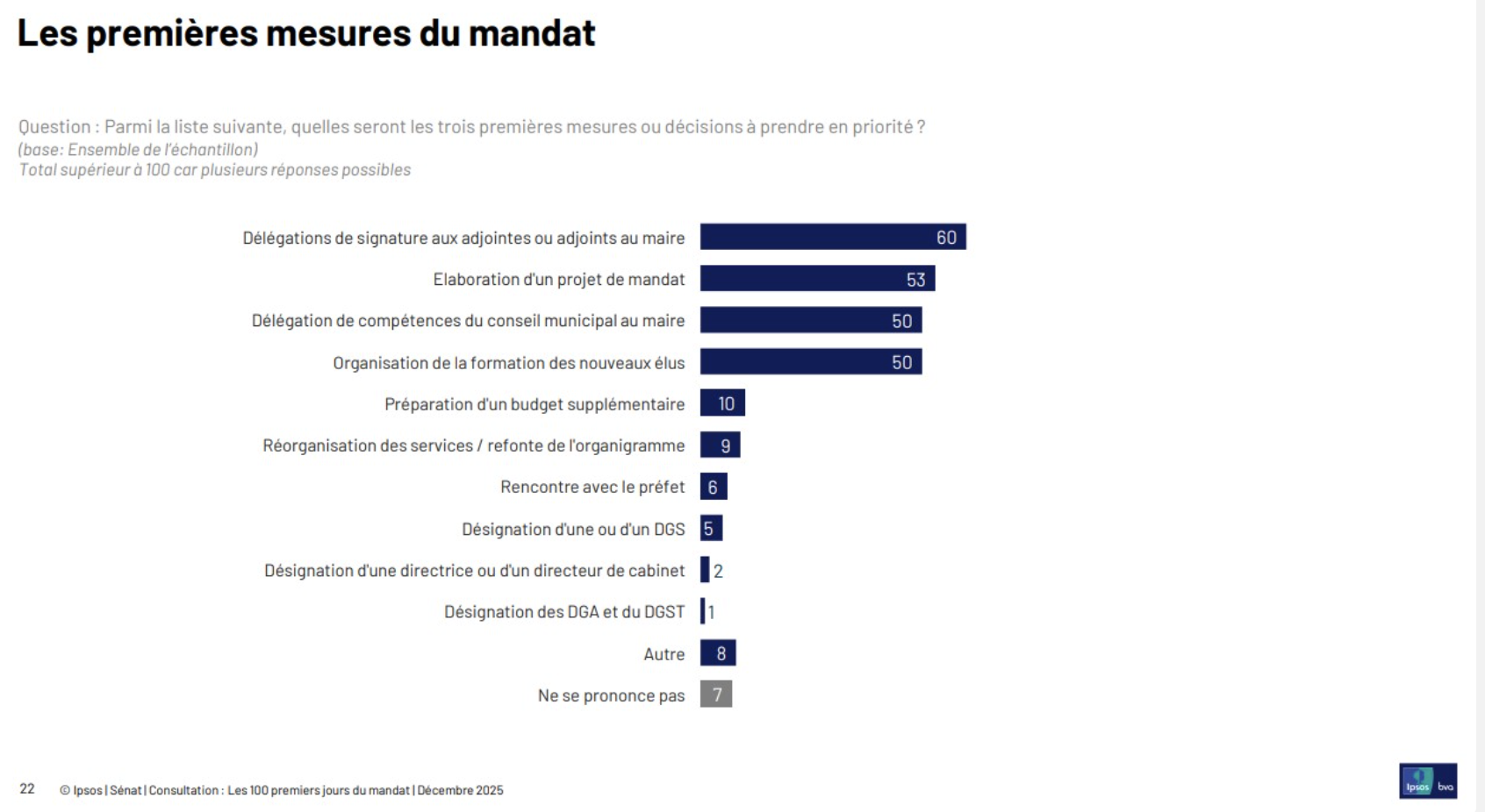 Une fois élus, leurs priorités sont clairement identifiées. 60 % prévoient de mettre rapidement en place des délégations de signature aux adjoints afin de structurer l’exécutif municipal. 53 % souhaitent formaliser le projet de mandat, véritable feuille de route politique, tandis que 50 % jugent prioritaire la formation des nouveaux élus.