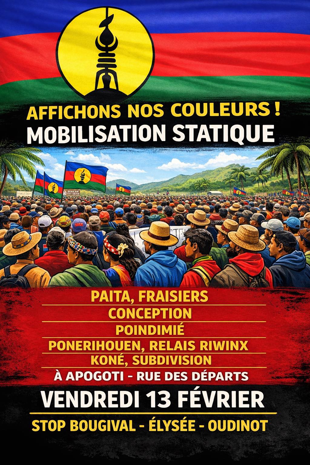 Sur l’affiche diffusée en ligne, le mot d’ordre est clair : « Affichons nos couleurs ! Mobilisation statique ». Les hashtags #KanakyResistance, #decolonisation ou encore #OnEstEnsemble viennent renforcer la tonalité politique du message.