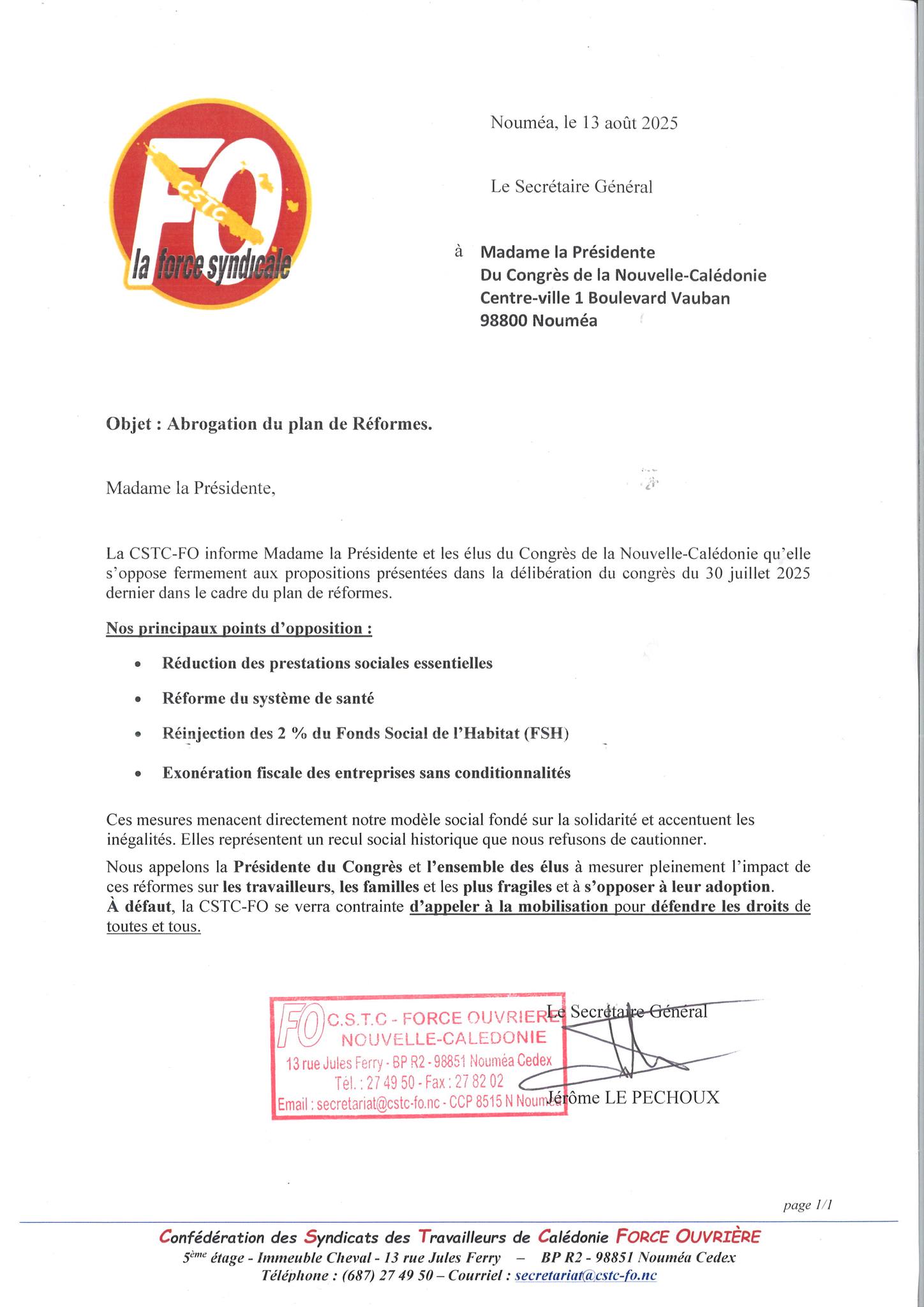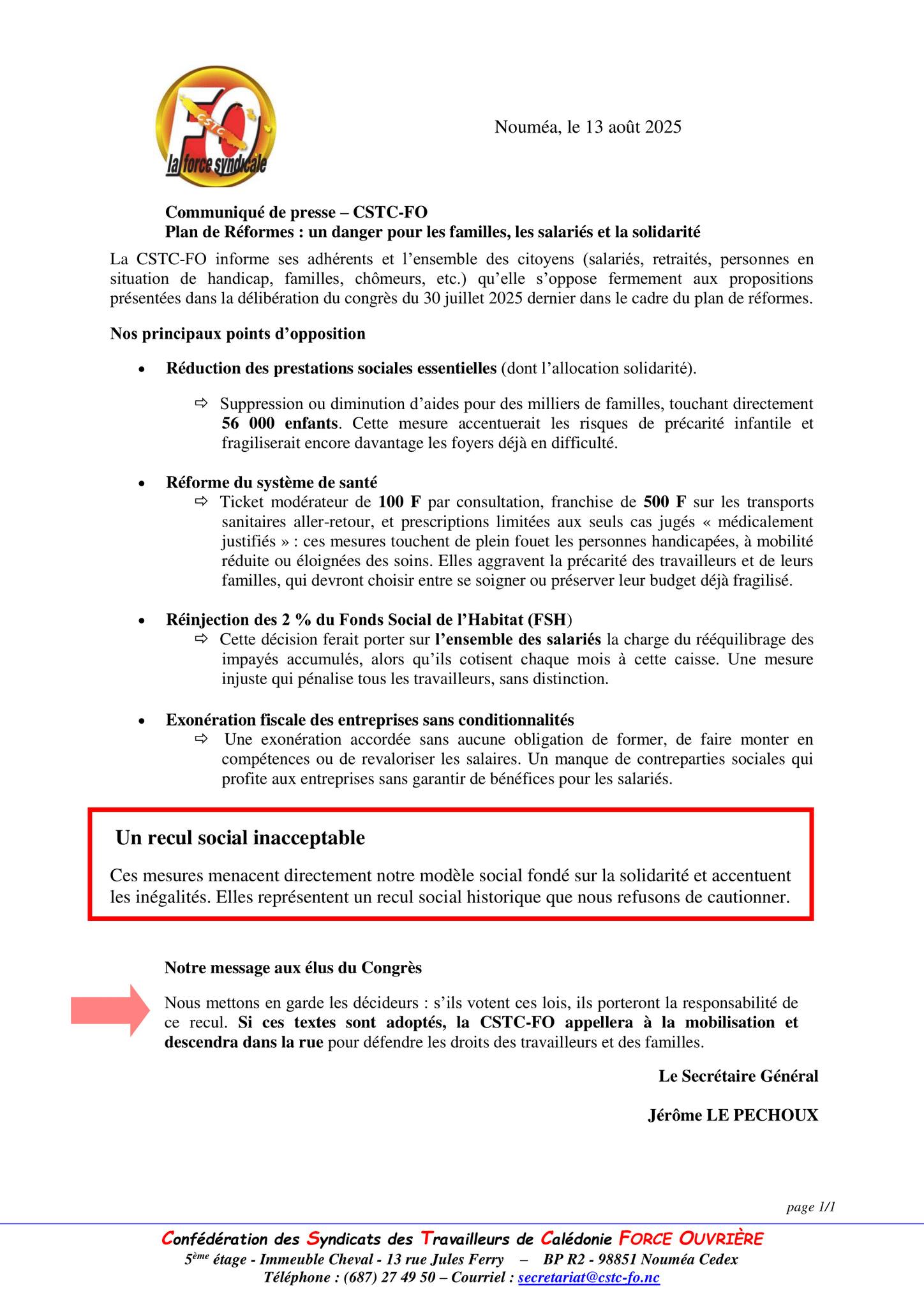 À Nouméa, certains syndicats, dont la CSTC-FO, se dressent contre ce qu’ils considèrent comme une attaque directe contre les acquis sociaux.