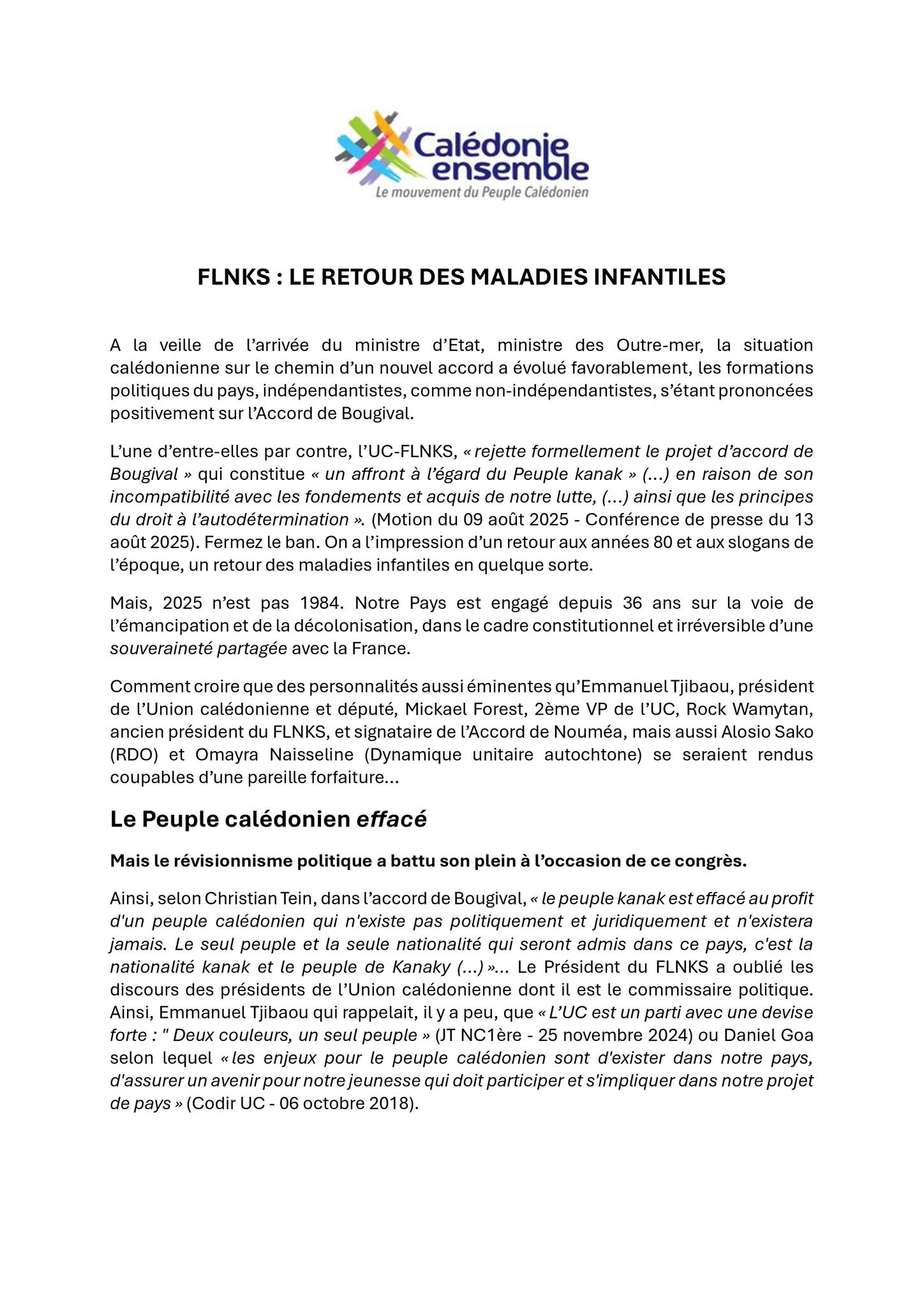 Depuis le 12 juillet et la signature de l’Accord de Bougival, Calédonie Ensemble s’érige en gardien de la parole donnée. Là où certains partis hésitent, tergiversent ou contestent, le mouvement de Philippe Gomès affiche une ligne de conduite claire : pas de reniement, pas de recul.