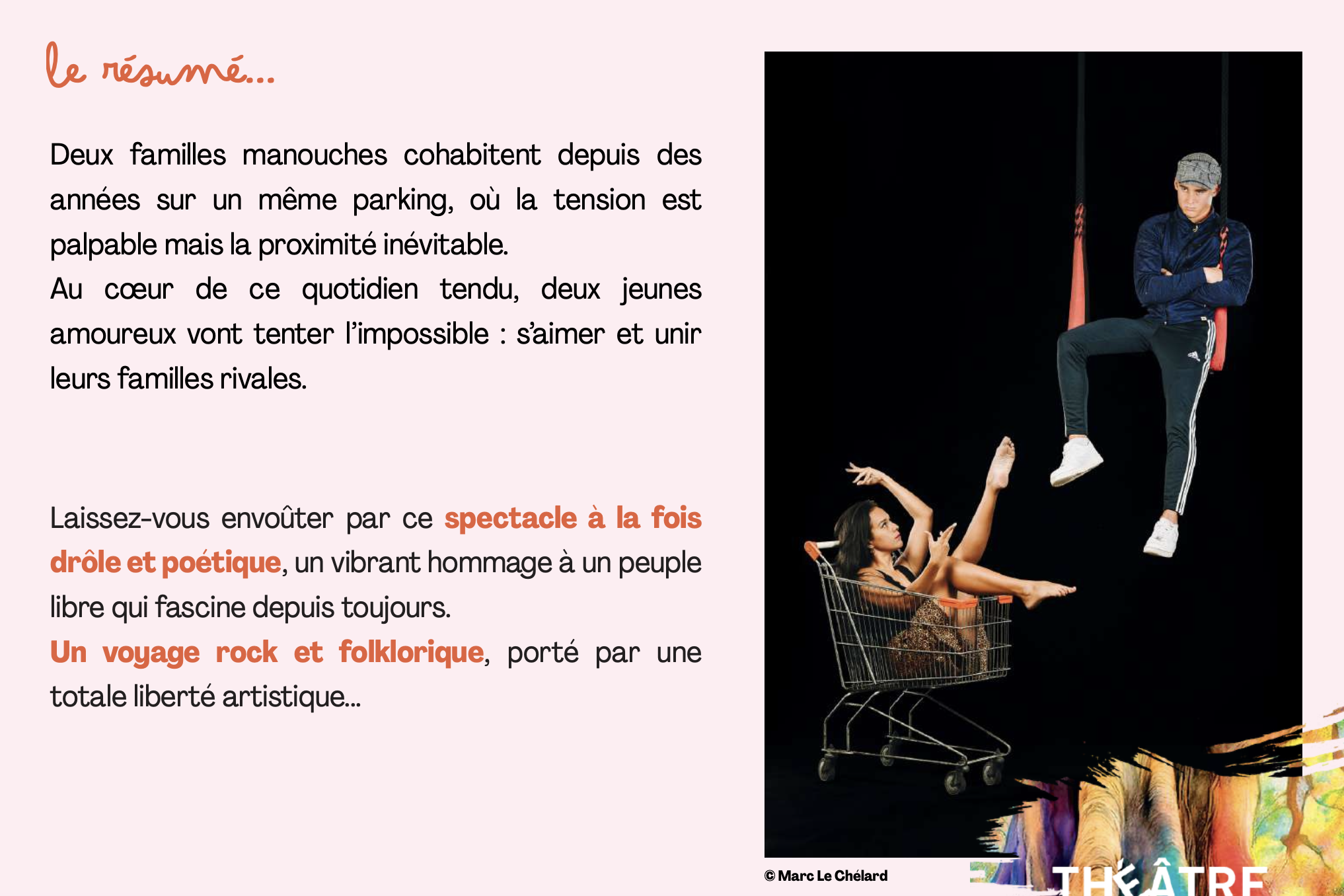 Pour relier les numéros, un fil narratif simple et efficace : deux familles manouches qui cohabitent sur un parking. Conflits, défis, coups d’éclat et bien sûr une histoire d’amour qui bouscule les rivalités. L’esthétique est assumée : fresque populaire, humour, chaleur et un imaginaire de la route. Les tableaux jouent des contrastes (duo intimiste / ensemble, silence / explosion musicale) et utilisent l’agrès comme véritable vecteur de récit, pas seulement comme démonstration technique. La mise en scène privilégie la lisibilité : entrées/sorties rapides, transitions chorégraphiées, montées en énergie par paliers.