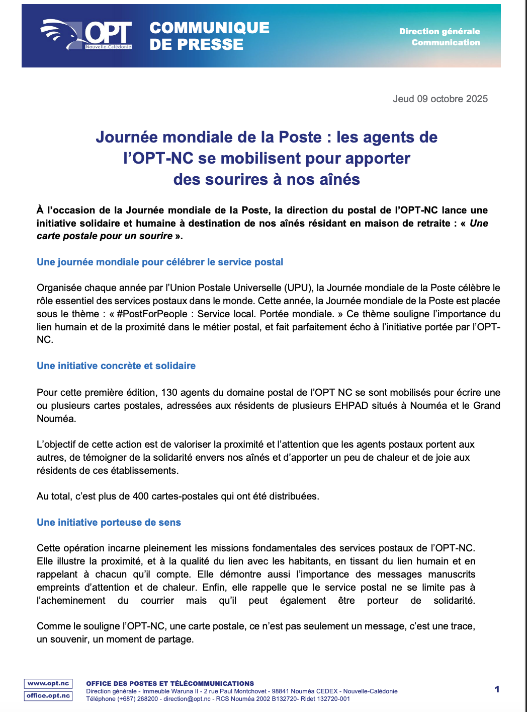 En célébrant la Journée mondiale de la Poste ainsi, les postiers calédoniens rappellent que le service public peut être à la fois moderne et profondément humain. La poste n’est pas qu’une infrastructure : c’est un lien vivant entre générations, entre îles et continents, entre les cœurs.