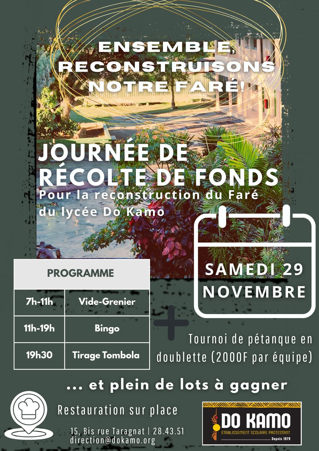 Le samedi 29 novembre 2025, dès 7h00, le lycée Do Kamo se transformera en vaste espace de mobilisation populaire. Objectif : rassembler des fonds, réaffirmer le lien communautaire, et préparer la reconstruction d’un faré qui n’a que trop souffert.